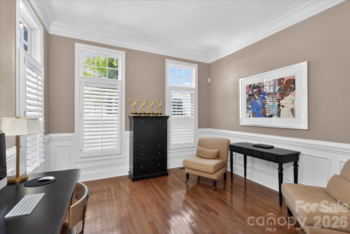 Classic Charleston Charm in the Heart of Ballantyne! Nestled on a quiet interior street in the award-winning Ardrey community, this home welcomes you with a classic rocking chair porch—the perfect spot for morning coffee. Inside, over 3,200 square feet of elegant living space is bathed in natural light filtered through beautiful plantation shutters. The functional floor plan features a main-level office for remote work and a primary suite retreat with a spa-like bath and dual walk-in closets. Fresh updates for 2026 include new carpeting throughout and updated light fixtures. Upstairs, discover three generously sized bedrooms and access to a second-story balcony that captures the community's signature Southern elegance. The outdoor living is a standout feature: relax in the enclosed sunroom or enjoy the professionally landscaped, fully fenced backyard. A private rear gate provides a short, car-free walk directly to the neighborhood’s pool, gym and park. The Ardrey Lifestyle: Experience a resort-style community that offers a hard-to-match amenity package. Residents enjoy a welcoming clubhouse and state-of-the-art fitness center, a resort-style outdoor pool, a playground, and bocce courts. The neighborhood is designed for connection with extensive sidewalks, multiple neighborhood parks, and a dedicated dog park. Best of all, lawn maintenance is included in the HOA dues, giving you back your weekends. All of this is just moments from top-rated schools and the premier shopping and dining of Ballantyne.