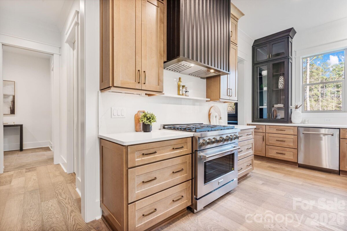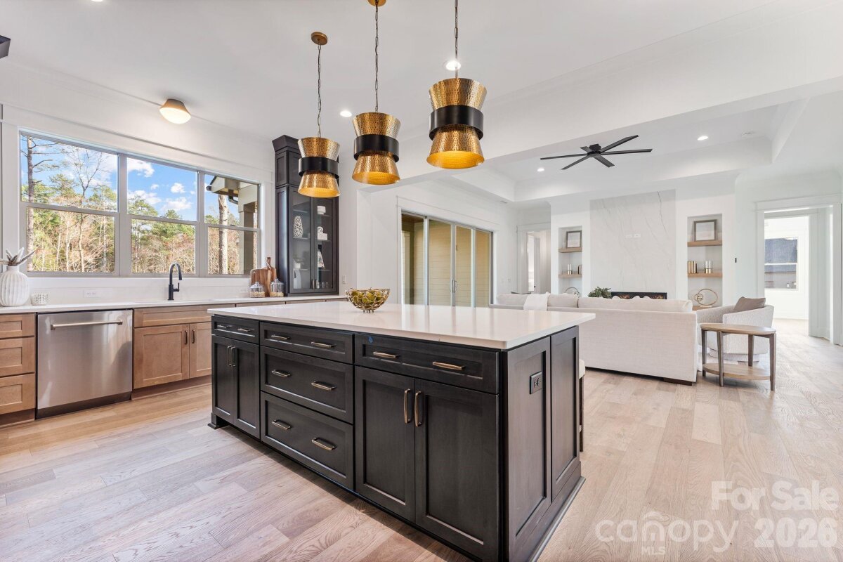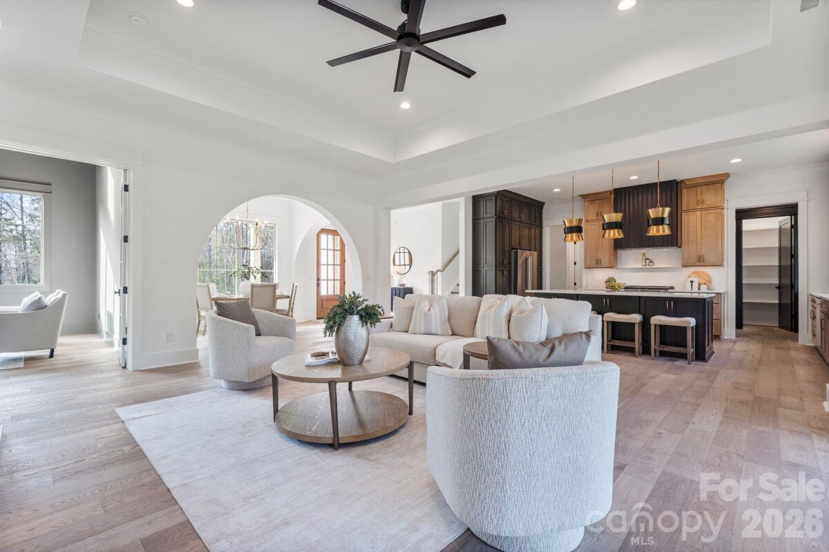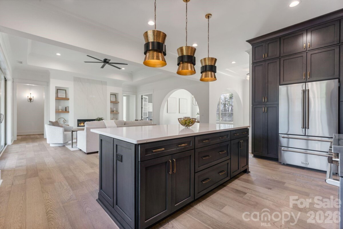 Nestled within an intimate 36-homesite community where every residence sits on over an acre of land, this exceptional home represents a level of craftsmanship and architectural detail rarely found in the Clover market. Perfectly positioned along the community pond, the property enjoys peaceful water views and a setting that blends privacy, space, and natural beauty. From the moment you arrive, the striking exterior architecture and beautifully manicured grounds set the tone for what lies inside. Full sod and irrigation frame the home, while the thoughtfully designed layout and placement on the homesite create an inviting sense of openness and tranquility. Step inside and immediately appreciate the refined design and attention to detail. Elegant architectural arches create graceful transitions throughout the home, adding a level of character and sophistication rarely seen in newer construction. The open floor plan allows natural light to fill the main living spaces, while a carefully curated lighting package enhances the warm and welcoming atmosphere. At the heart of the home is a stunning chef’s kitchen that balances beauty and functionality. Extensive custom cabinetry, a statement vent hood, marble countertops, farmhouse sink, and high-end appliances create a space designed for both entertaining and everyday living. The kitchen flows seamlessly into the spacious living area, where a sleek fireplace and thoughtfully designed built-ins create the perfect setting for gathering with family and friends. The primary suite offers a peaceful retreat, featuring a beautifully designed bath complete with a large walk-in shower, freestanding soaking tub, and custom cabinetry that blends elegance with everyday comfort. Upstairs, additional bedrooms and well-appointed bathrooms provide comfortable accommodations for family and guests, while a spacious upper-level bonus area offers flexibility for a media room, playroom, home office, or secondary living space. Outdoor living is equally inviting. The covered rear patio overlooks the community pond, creating a serene backdrop for morning coffee, evening relaxation, or entertaining while enjoying the quiet natural surroundings. Located just minutes from dining, shopping, coffee shops, and everyday conveniences — and only a short drive to Charlotte Douglas International Airport — this remarkable property offers the rare opportunity to enjoy space, privacy, and luxury living in one of Clover’s most distinctive communities. This is more than a home — it is a showcase of quality, thoughtful design, and timeless craftsmanship.
