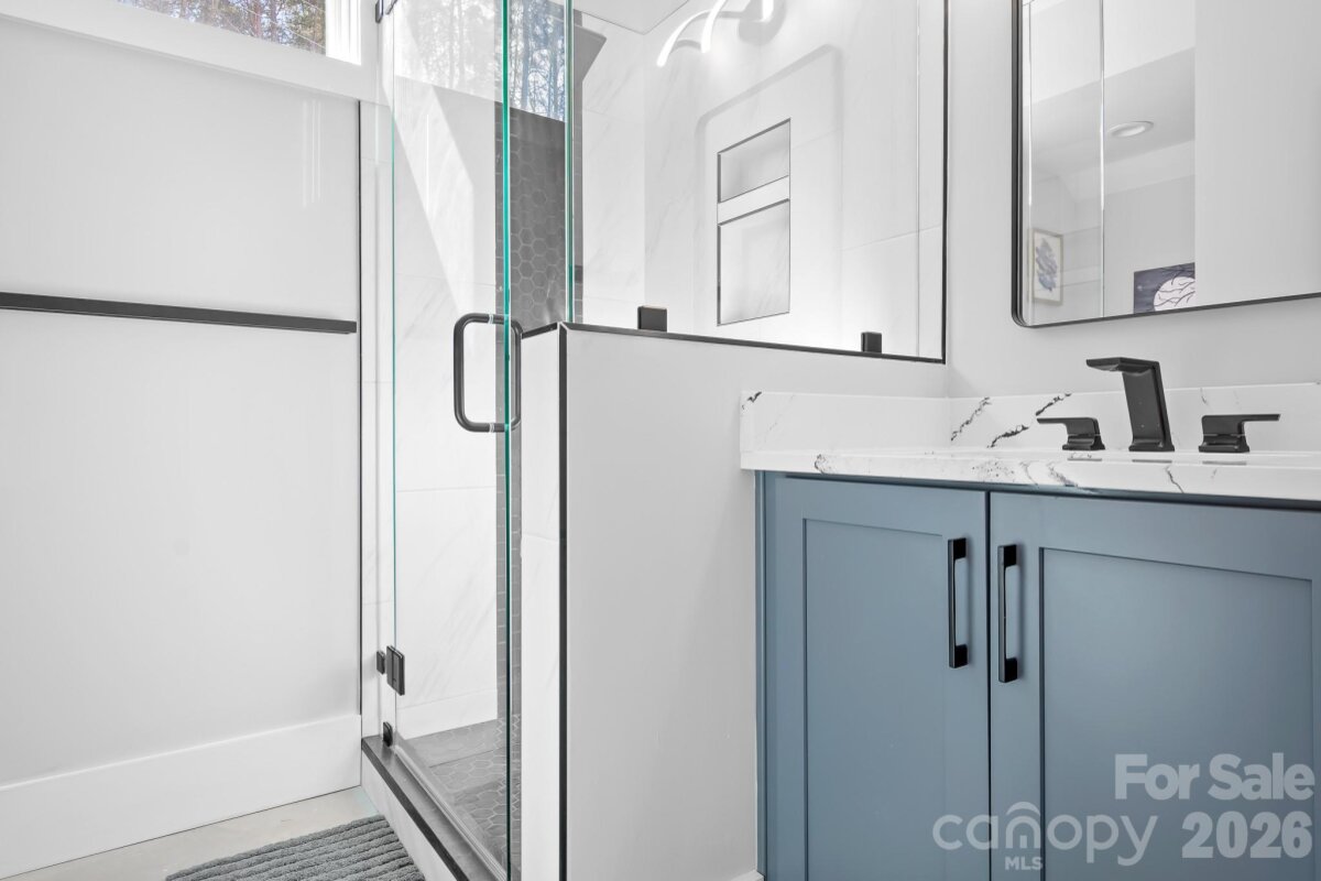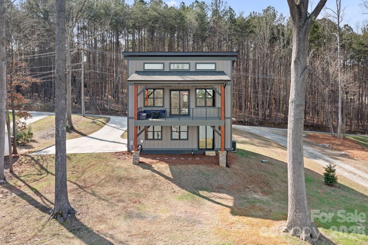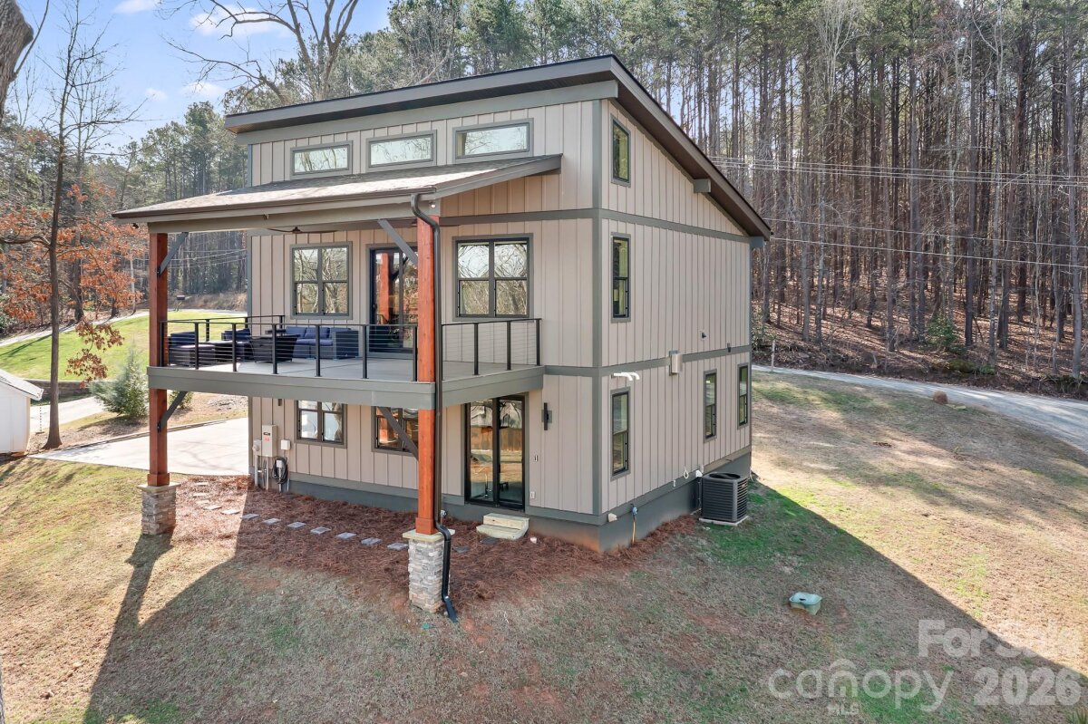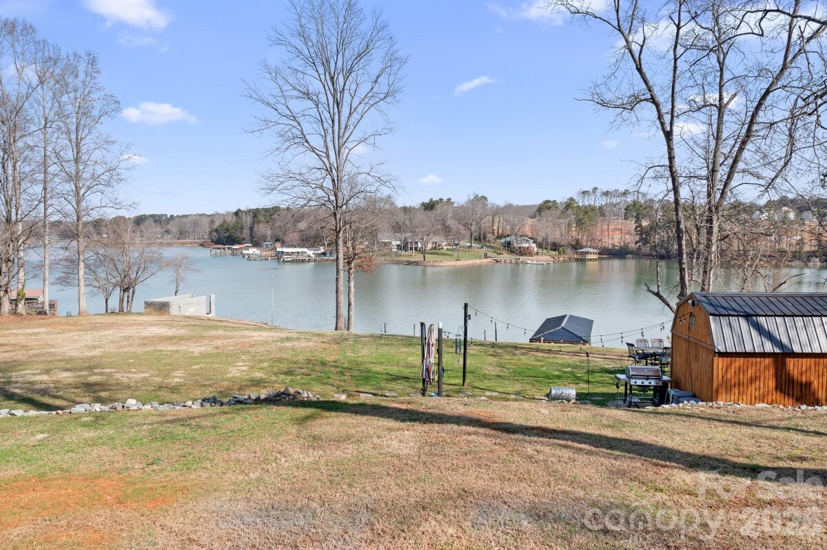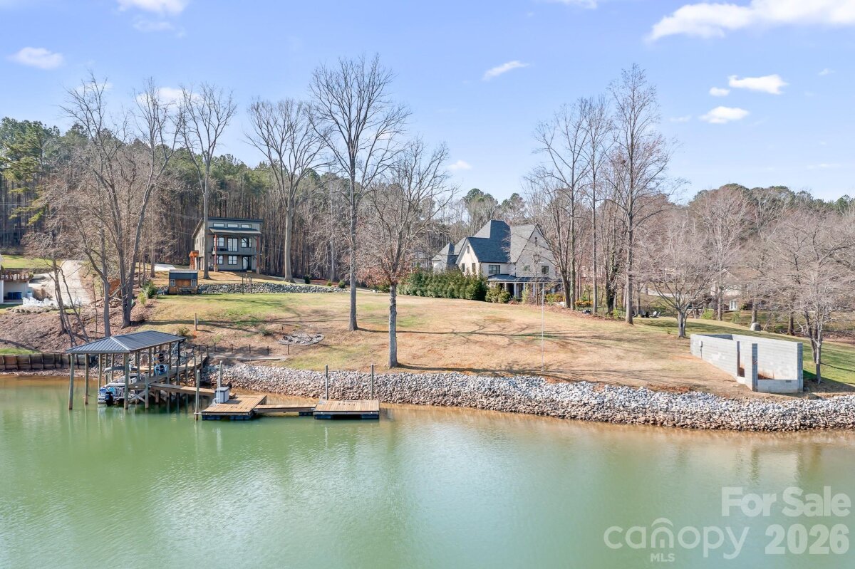Over 1 acre of Magnificent waterfront unrestricted land (NO HOA) with approx 217' of stabalized shoreline, a 40' covered fixed boatslip and additional floating dock. Build your future home while you live in the 2024 build secondary home with 2 bedrooms a dedicated office or you could use this as a 3rd bedroom and 2 car garage. No expense was spared during the construction. The complete Kitchen Aid appliance package, Additional holiday dishes can be stored in the hidden cabinets in front of the bar stools, Tankless propane water heater, Sono's sound system indoor and out, complete wifi home and wifi at the dock, Lake fed irrigaion pump installed, Power at the dock for a future lift, Smart home wiring, Generator transfer switch installed, 30amp Electric car charger in the garage and so much more. You never have to worry if you have enought dock space for your friends and family. Enjoy every night sitting on your covered porch or on the covered dock with a seating area. Fall firepit nights with the peace and tranquility you have been searching for. Bring your own builder or have a chat with the builder that constructed this wonderful open floor plan contemporary home. Did we mention there is a former block boathouse that could be converted into a Jimmy Buffet style waterfront retreat. Long range waterfront views from the primary bedroom, great room, kitchen and home office. You can enjoy Lake Norman year round with deep water even when Duke energy brings the lake down during the winter months. You can realize what you have vizualized in your new construction home or just enjoy the current home and the lay of the level land. We've included a sample rendering of the primary home which was going to be constructed with the garage and front door on the street side with a wall of sliding glass doors for the bunk room, bathroom and hall. Basically flipping the garage level from back to front. To access the home office or could be used as a 3rd bedroom, enter throught the garage. Magnificent Waterfront views from the sliding glass door.