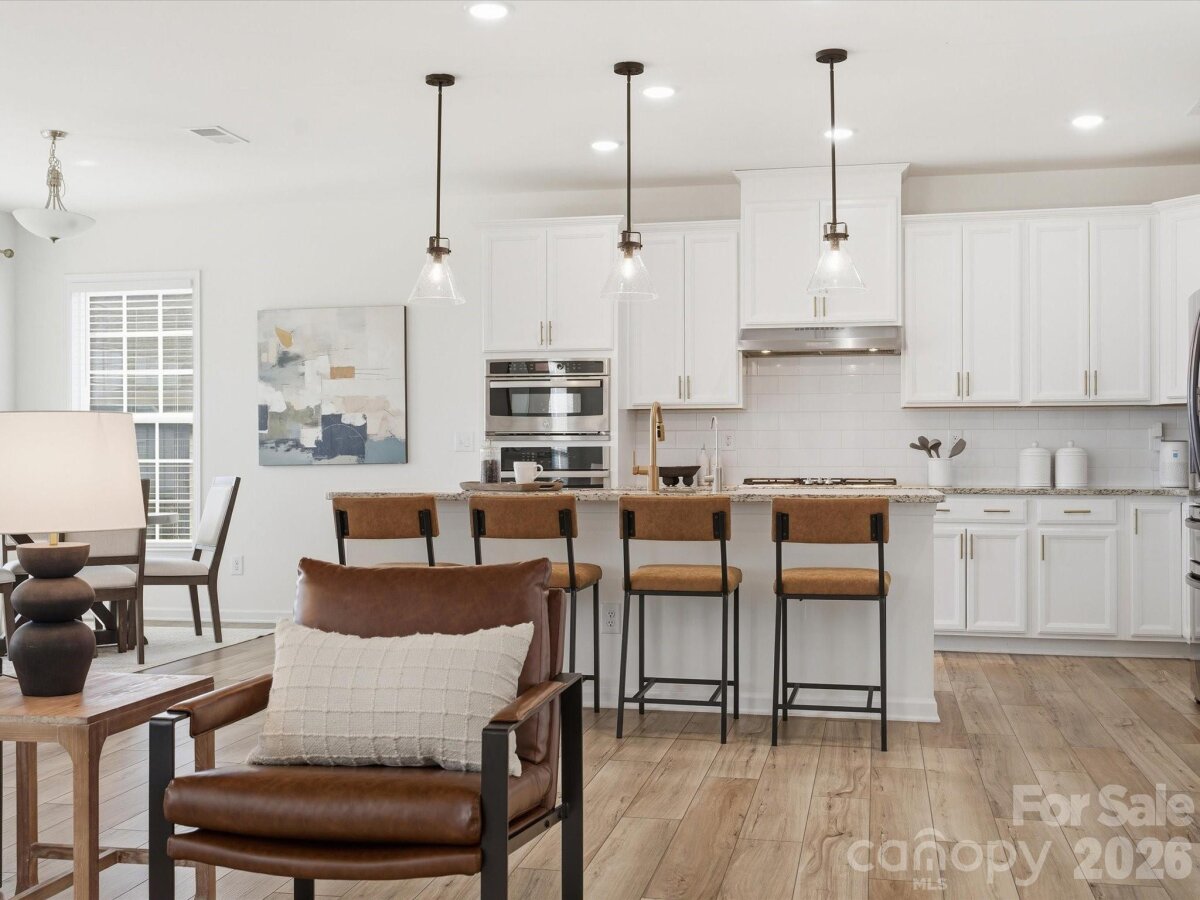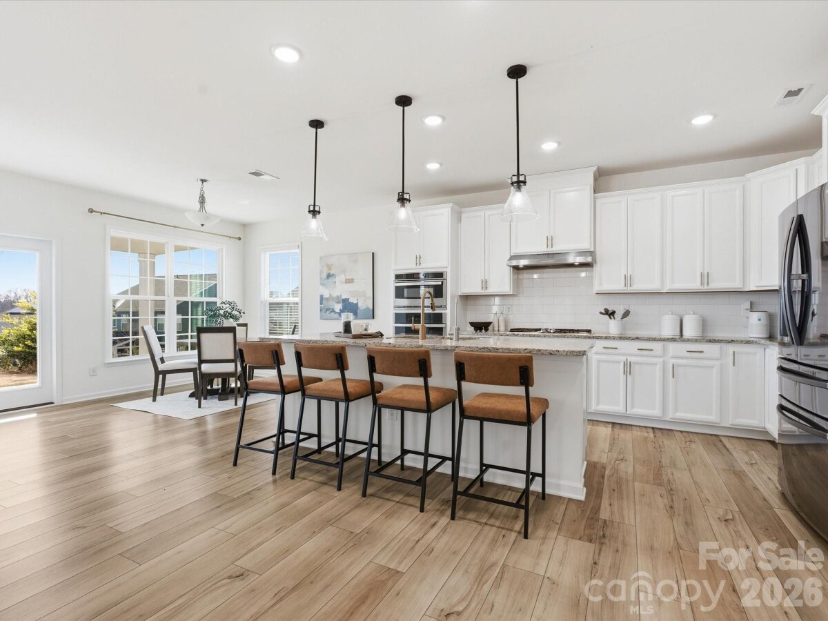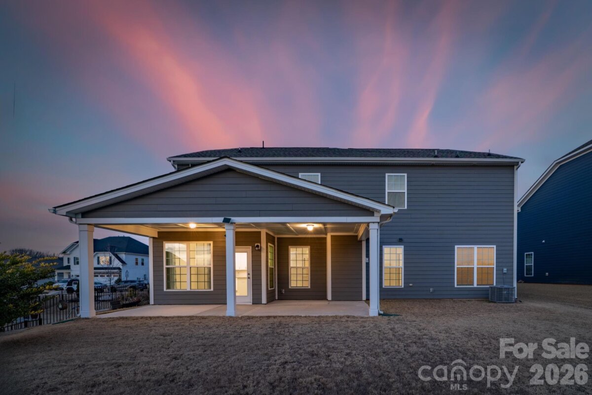 Exceptional, move-in-ready living awaits in this stunning 5-bedroom, 4-bath residence adorned with elegant stone accents, nestled in the highly sought-after Covington community—just minutes from Charlotte’s prestigious Ballantyne area, offering premier shopping, dining, and effortless highway access for an easy commute. A grand two-story foyer sets the tone, leading into a beautifully appointed main level featuring durable, designer LVP flooring and a sophisticated neutral palette throughout. The expansive formal dining room is ideal for hosting unforgettable gatherings. At the heart of the home, the gourmet kitchen impresses with crisp white cabinetry accented by antique gold hardware, wall ovens, gas cooktop with vented hood, oversized island with seating, sun-filled breakfast area, and a spacious walk-in pantry—perfect for both everyday living and elevated entertaining. The main level also offers a private guest bedroom with full bath, an inviting great room with a gas fireplace, and a convenient office nook. Step outside to unwind on the covered patio, creating a serene outdoor retreat ideal for morning coffee or evening relaxation. The upper level is highlighted by an expansive primary suite featuring a tray ceiling and a spa-inspired bath with a generous walk-in closet, dual-sink vanity, tiled shower, and a separate soaking tub. A conveniently located upstairs laundry room with a utility sink adds everyday ease. Three additional bedrooms and two full bathrooms complete the second level, offering ample space and comfort. Residents enjoy a community pool, clubhouse and playground.