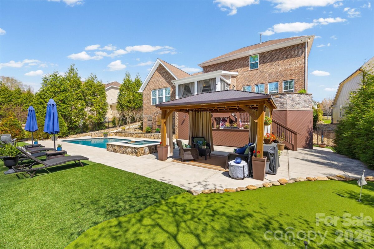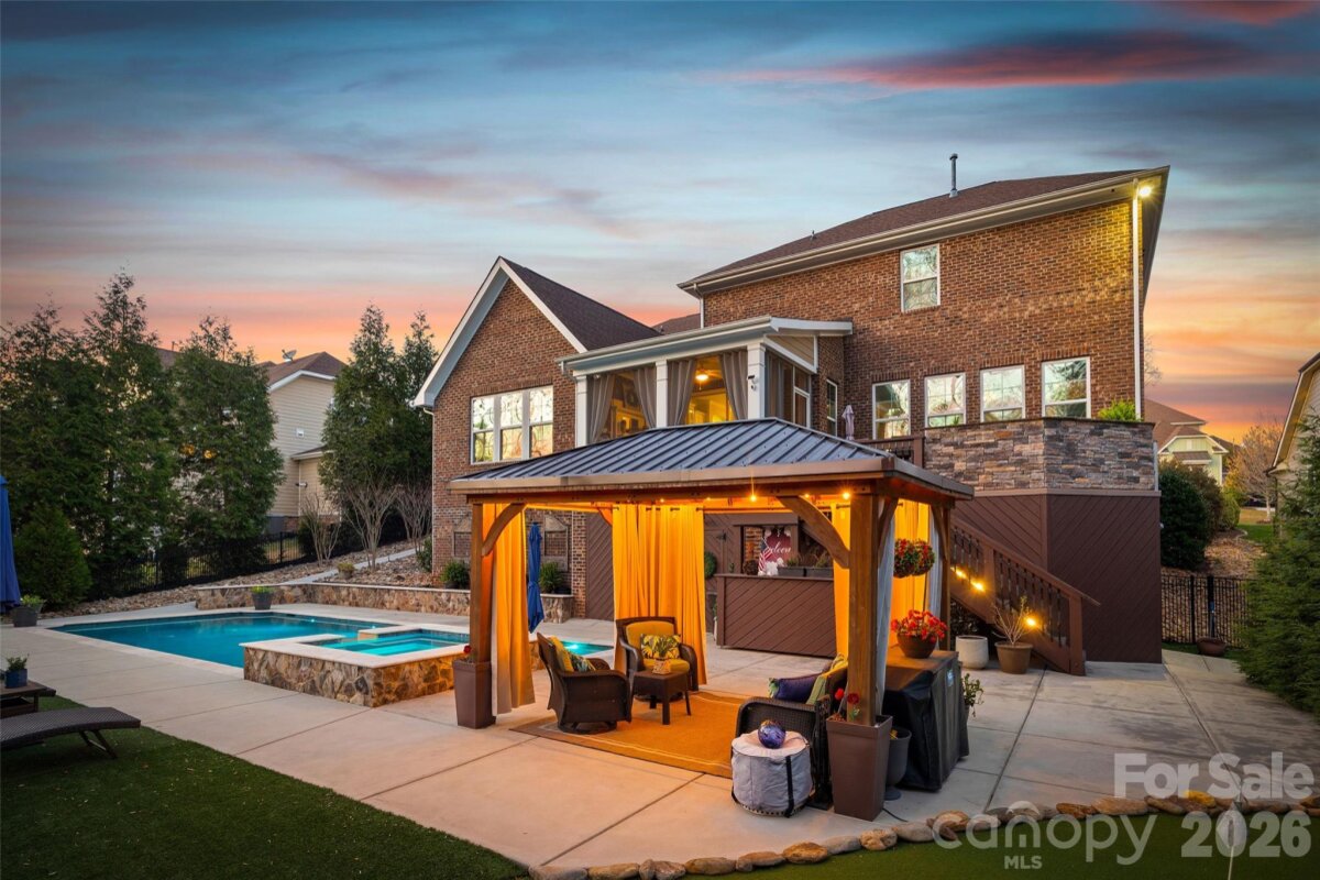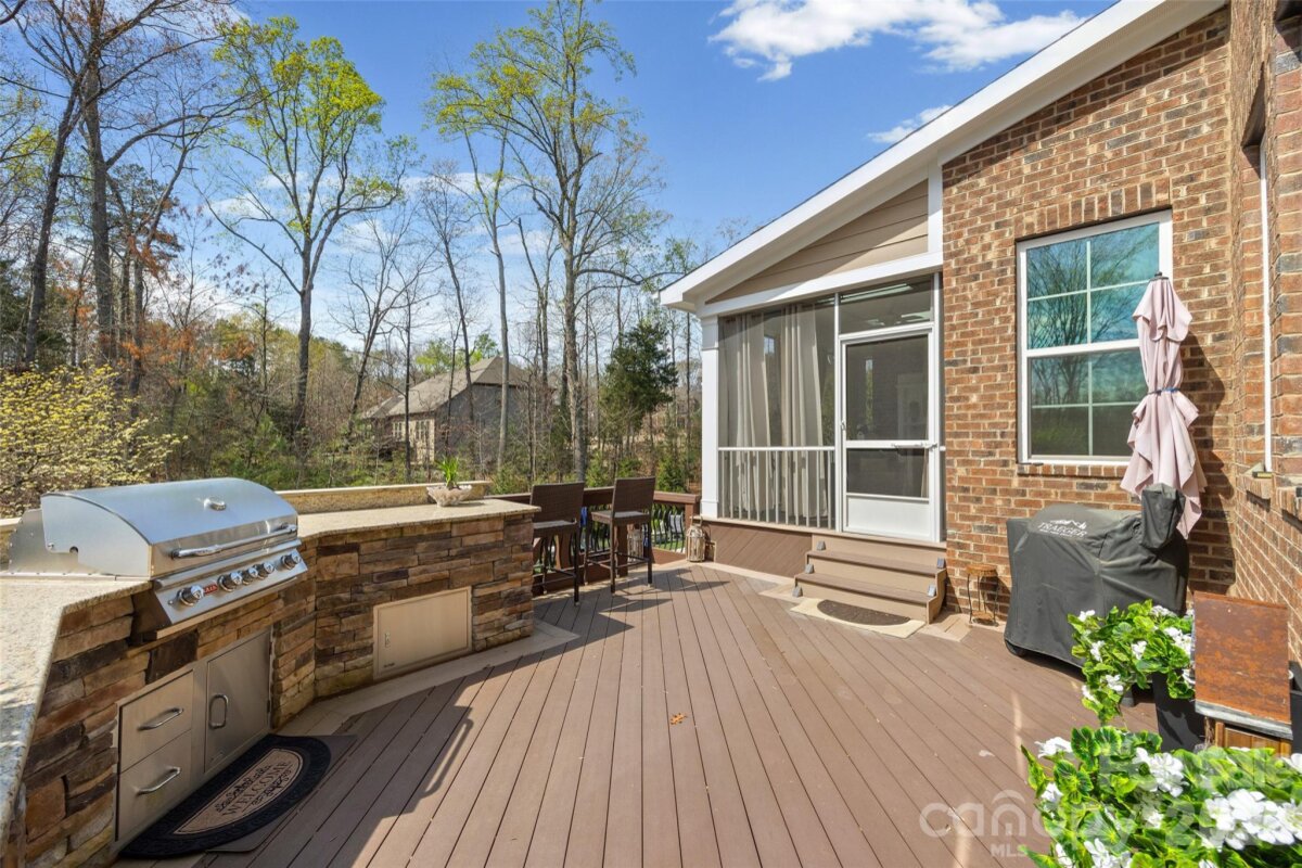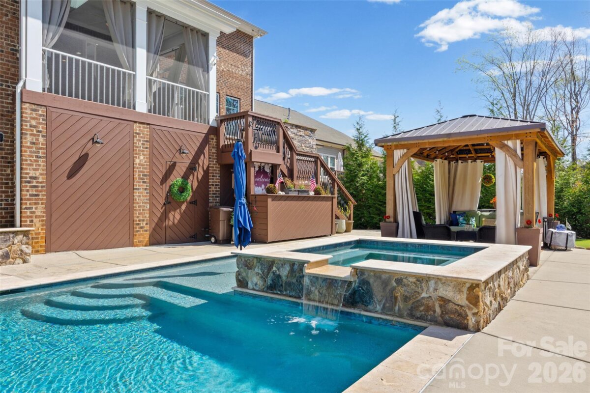 Nestled in a wooded backdrop, the immaculately maintained, full-brick home in prestigious Eppington South, features a heated pool with a hot tub as the centerpiece of this backyard retreat. You can feel the custom finishes from the moment you step in from the covered front porch, onto gleaming handscraped hardwoods that run throughout the entire home (no carpet). The entrance foyer is flanked by an office or flex space with gorgeous French Doors, and a dining room with a butler's pantry that leads into a chef's kitchen. An expansive island anchors the kitchen, which boasts a gas range with a wood hood, double ovens, microwave in the island, Frigidaire Gallery series stainless steel refrigerator (included), Rev-A-Shelf and additional cabinet pullouts, designer knobs, breakfast area, and more. The kitchen opens to the great room, which features a brick gas fireplace providing a cozy atmosphere, and the ample windows provide views to the tree-lined backyard. The oversized primary suite on the main floor is tucked away, and features ceiling trim, split-vanities in the bathroom, a tiled walk-in shower with a bench, soaking tub for evening relaxation, and dual custom owner's closets with convenient access to the laundry room. The laundry room provides loads of extra storage, and access through to the drop zone area with built-ins. The downstairs half bath has been upgraded with a custom vanity and designer tile on the walls, over board and batten wainscoting. The open stair rail leads you to a large upstairs loft area, and upstairs you'll find 3 bedrooms with walk-in closets, another generous bedroom or bonus space, 2 full bathrooms, and 2 walk-in attic areas for extra storage. As you head outside you start at a screened porch off the breakfast area, which is the perfect spot to enjoy your morning coffee. The uncovered deck space with a built-in grill center is perfect for entertaining, and offers great views of this outstanding backyard! The PebbleTec finish heated pool has a hot tub with a waterfall into the pool, providing a peaceful ambiance. There is turf around the pool for easy maintenance, and a pergola with a seating area to enjoy the shade. A golfer's dream with a putting green, or fun for the golf recreation novice. You'll find abundant seating around the pool, and even a pool area half bathroom, with storage for convenience. There is ample parking, including a three-car garage and an expanded driveway, and includes details such as landscape and accent lighting. The homeowners have maintained this home to perfection, adding additional landscaping and privacy trees in the front and backyard, Wi-Fi-controlled trim lighting, tinted windows for energy improvement, and more! Be sure to see the full list of seller upgrades. Eppington South has one of the most central locations in Fort Mill, just minutes from I-77, located right off Gold Hill Rd, and with low SC taxes and award-winning schools, look no further for your ideal Fort Mill home!