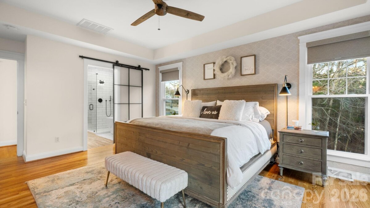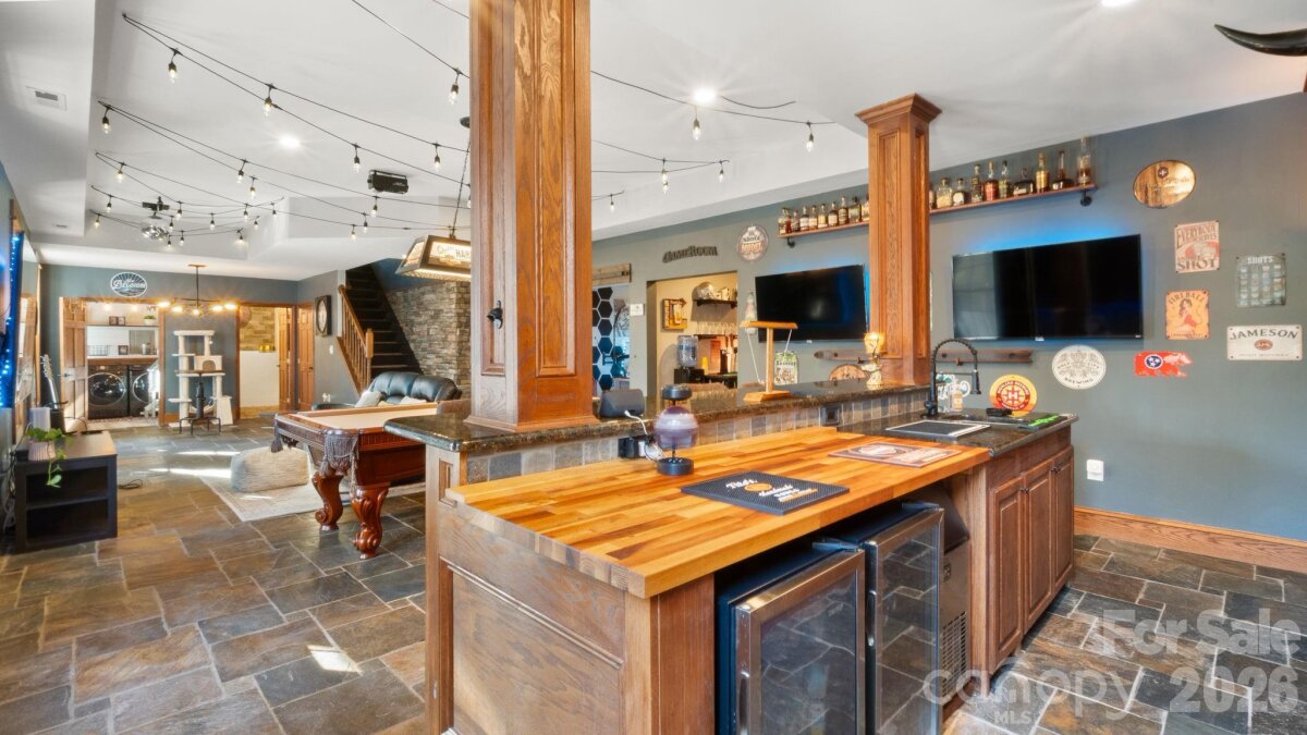 This stunning Saussy Burbank home sits on a corner lot with a wooded backyard, giving you privacy and easy access to miles of hiking and biking trails! The interior is uniquely designed and immaculately maintained by the current owners. Featuring a new chef’s kitchen with top of the line appliances, and a bright open floor plan. The dining and kitchen area transitions seamlessly outdoors to a screened porch and a separate grilling deck. The main level primary suite includes an updated bathroom with double vanities, a garden tub, and a spacious walk in closet. As a fully integrated smart home, the property offers modern tech throughout its versatile layout. Upstairs you will find three bedrooms, a Jack and Jill bath, a second full bath, and an oversized bonus room that easily serves as a fifth bedroom. The standout and rare feature of this home is the basement finished with authentic Pennsylvania Bluestone floors, a full custom bar, a private office, and a dedicated workout/flex room. This level opens directly to a heated pool and private wooded lot. Enjoy access to two community pools, tennis courts, playgrounds, and nature trails. This home is within walking distance of the shops and dining on Baxter's Market Street and just minutes from grocery stores and daily essentials. Plus, being right off I 77 makes for a quick and easy commute to Uptown Charlotte and the airport. Come see all the unique features that make this home a true standout in Baxter, showings begin March 27th!