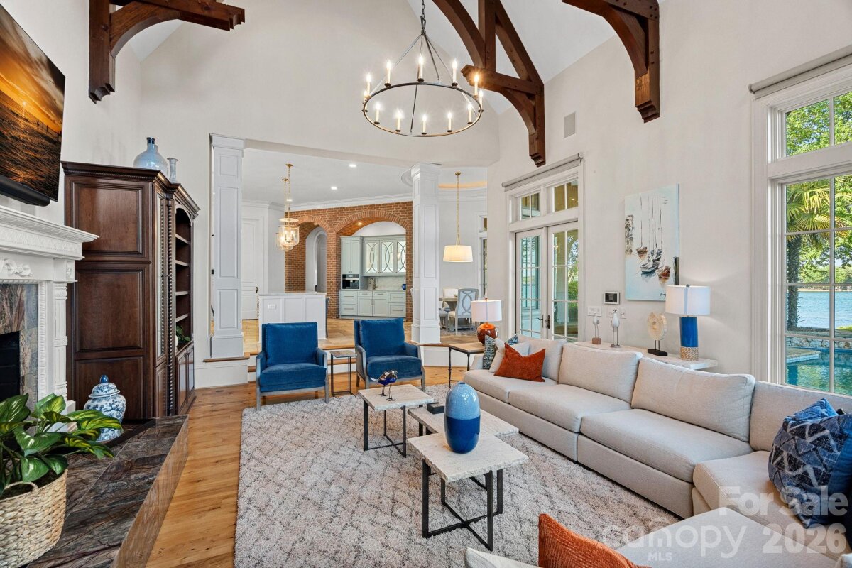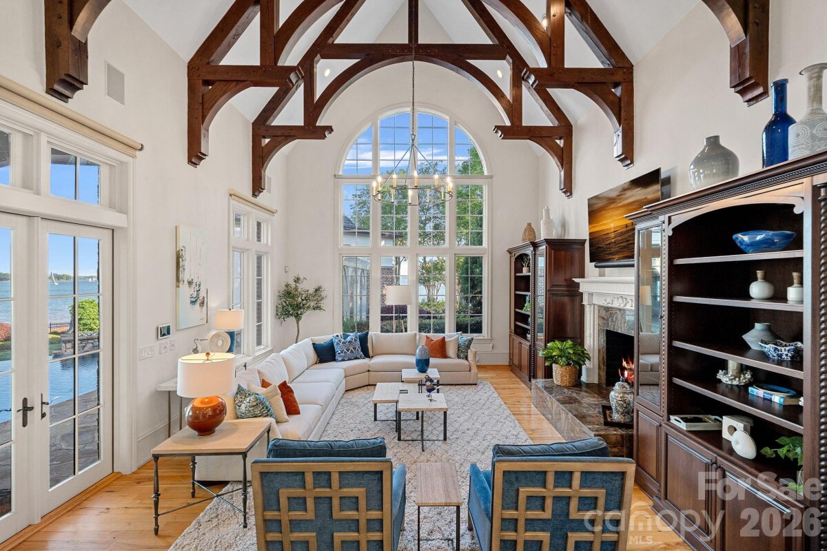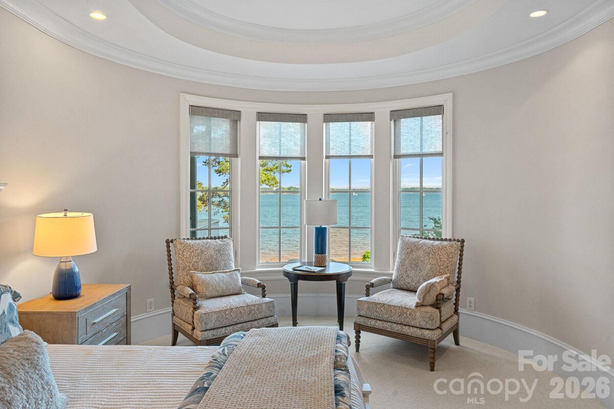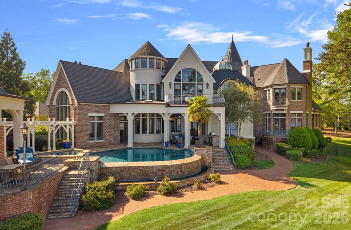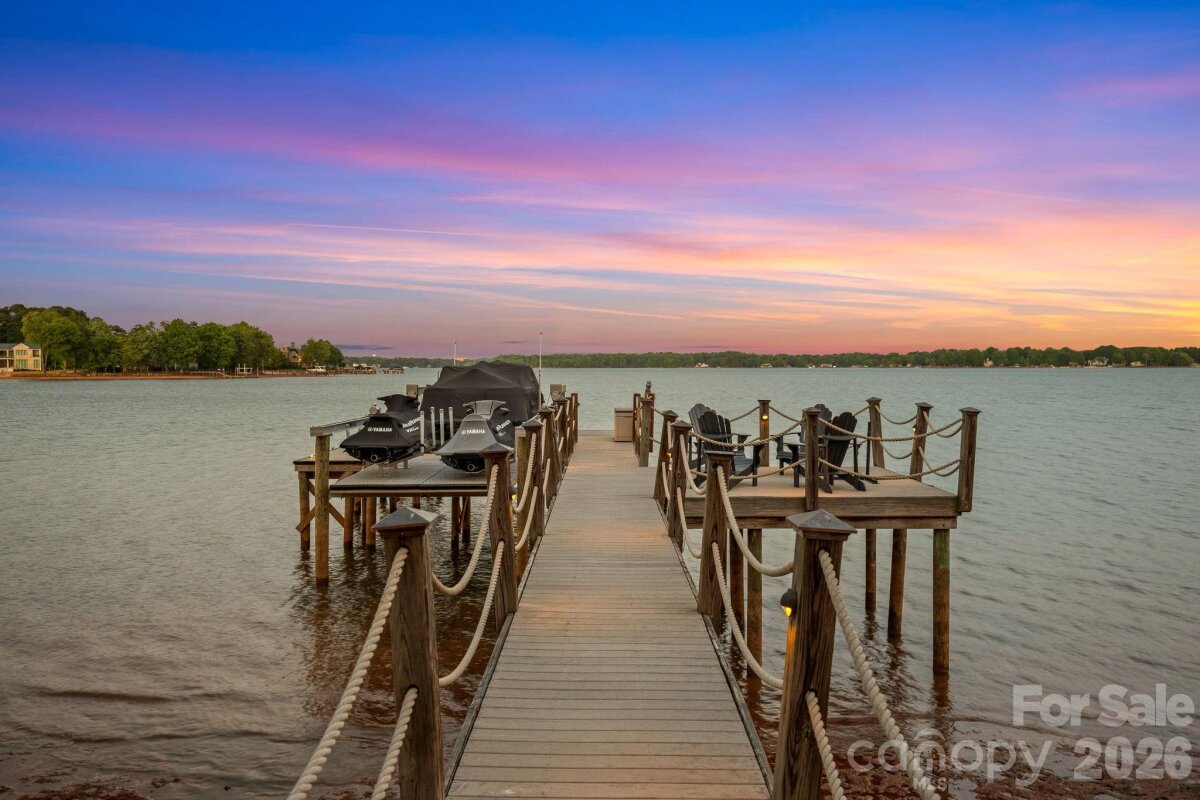 Set on approximately 1.48 private acres with approximately 450 feet of open, deep-water shoreline, 109 Conway Court is a rare waterfront estate located on one of The Point’s most coveted addresses. This architecturally significant residence offers an extraordinary combination of scale, craftsmanship, and lakefront living. A dramatic arrival begins with a cobblestone motor court and four-car attached garage, leading to a grand entry with a soaring two-story foyer featuring walls of glass and a striking custom circular staircase of wrought iron and wood. The home’s exterior is a timeless blend of brick, stone, wood, and stucco. The primary suite is a private lakeside sanctuary featuring a stone-surround fireplace, power blackout shades, cedar-lined walk-in closets, a private laundry room, and direct access to a waterfront patio. The spa-inspired bath includes radiant heated floors, freestanding soaking tub, luxe gold fixtures, marble vanities, Toto washlet, and designer lighting. Designed for both everyday living and large-scale entertaining, the gourmet chef’s kitchen features custom cabinetry by Impact Fine Design, exotic quartzite countertops, heated floors, two Bosch dishwashers, Miele coffee maker, and professional-grade appliances including Wolf and Sub-Zero refrigeration with multiple beverage drawers. Designer lighting curated from Visual Comfort completes the space. Entertaining spaces include a breathtaking two-story living room with custom bar opening to a covered waterfront patio, expansive great room with custom wood detailing, formal dining with butler’s pantry, temperature-controlled wine cellar (400–500 bottle capacity), and a second-level entertainment area with full bar and private lakefront terrace. Guest accommodations include four upper-level ensuite bedrooms, a richly detailed loft/library, and a separate approximately 675 sq ft waterfront guest house with full bath and steam shower. A private executive study on the third floor offers panoramic lake views through a curved wall of windows. Outdoor living is exceptional with a custom infinity pool and spa, private deep-water pier suitable for boats and PWCs, seawall, sandy beach, and expansive grounds that maximize open water views. An irreplaceable Lake Norman estate offering privacy, deep water, architectural distinction, and premier waterfront living within The Point.