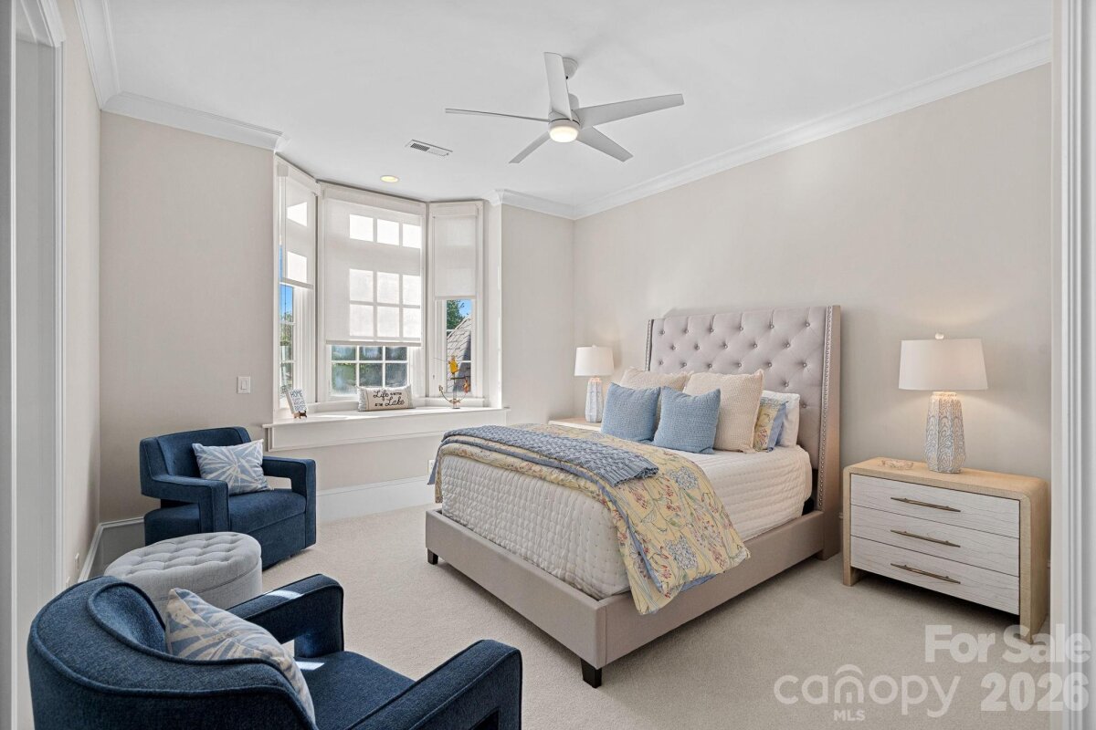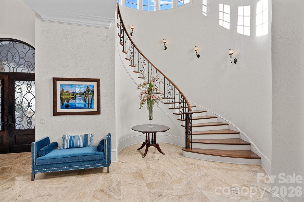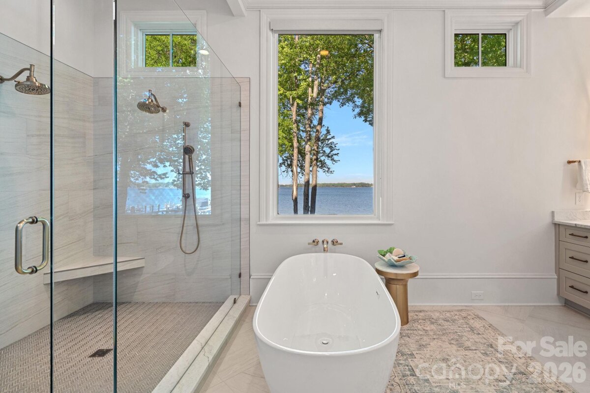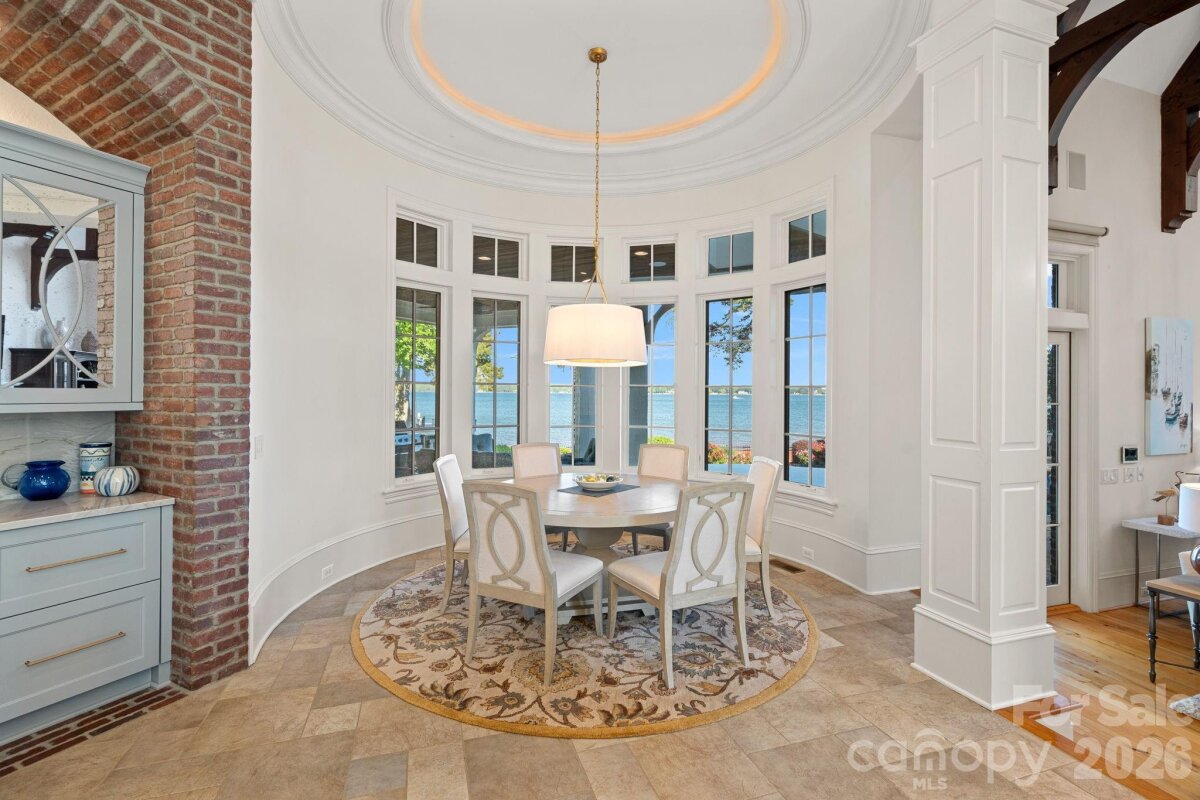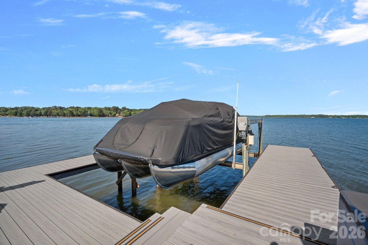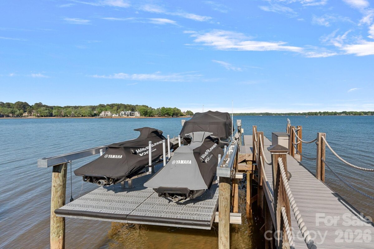Set on approximately 1.48 private acres with approximately 450 feet of open, deep-water shoreline, 109 Conway Court is a rare waterfront estate located on one of The Point’s most coveted addresses. This architecturally significant residence offers an extraordinary combination of scale, craftsmanship, and lakefront living. A dramatic arrival begins with a cobblestone motor court and four-car attached garage, leading to a grand entry with a soaring two-story foyer featuring walls of glass and a striking custom circular staircase of wrought iron and wood. The home’s exterior is a timeless blend of brick, stone, wood, and stucco. The primary suite is a private lakeside sanctuary featuring a stone-surround fireplace, power blackout shades, cedar-lined walk-in closets, a private laundry room, and direct access to a waterfront patio. The spa-inspired bath includes radiant heated floors, freestanding soaking tub, luxe gold fixtures, marble vanities, Toto washlet, and designer lighting. Designed for both everyday living and large-scale entertaining, the gourmet chef’s kitchen features custom cabinetry by Impact Fine Design, exotic quartzite countertops, heated floors, two Bosch dishwashers, Miele coffee maker, and professional-grade appliances including Wolf and Sub-Zero refrigeration with multiple beverage drawers. Designer lighting curated from Visual Comfort completes the space. Entertaining spaces include a breathtaking two-story living room with custom bar opening to a covered waterfront patio, expansive great room with custom wood detailing, formal dining with butler’s pantry, temperature-controlled wine cellar (400–500 bottle capacity), and a second-level entertainment area with full bar and private lakefront terrace. Guest accommodations include four upper-level ensuite bedrooms, a richly detailed loft/library, and a separate approximately 675 sq ft waterfront guest house with full bath and steam shower. A private executive study on the third floor offers panoramic lake views through a curved wall of windows. Outdoor living is exceptional with a custom infinity pool and spa, private deep-water pier suitable for boats and PWCs, seawall, sandy beach, and expansive grounds that maximize open water views. An irreplaceable Lake Norman estate offering privacy, deep water, architectural distinction, and premier waterfront living within The Point.