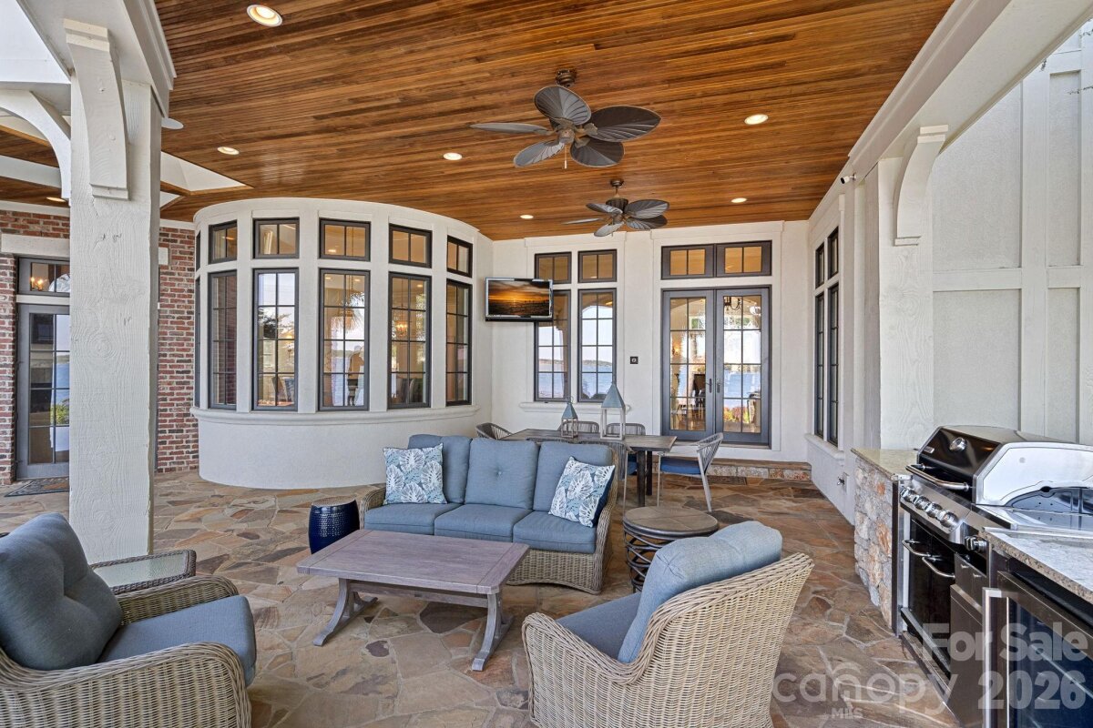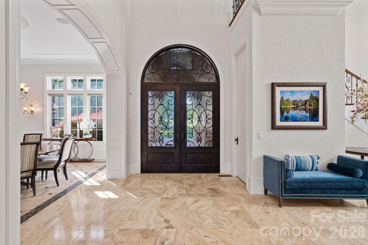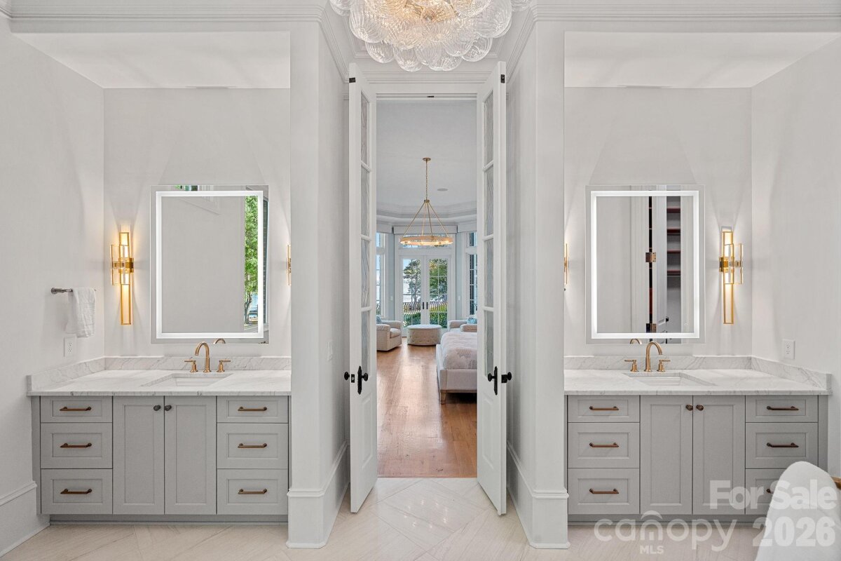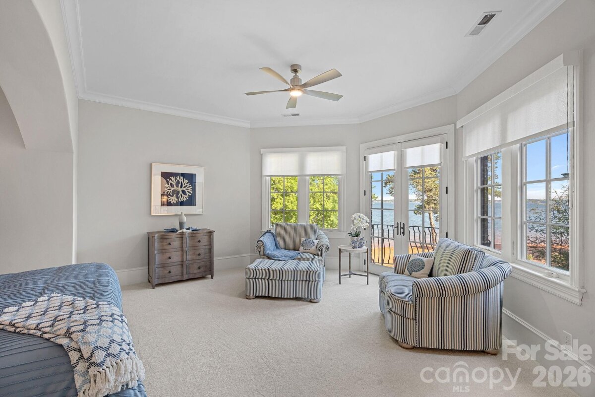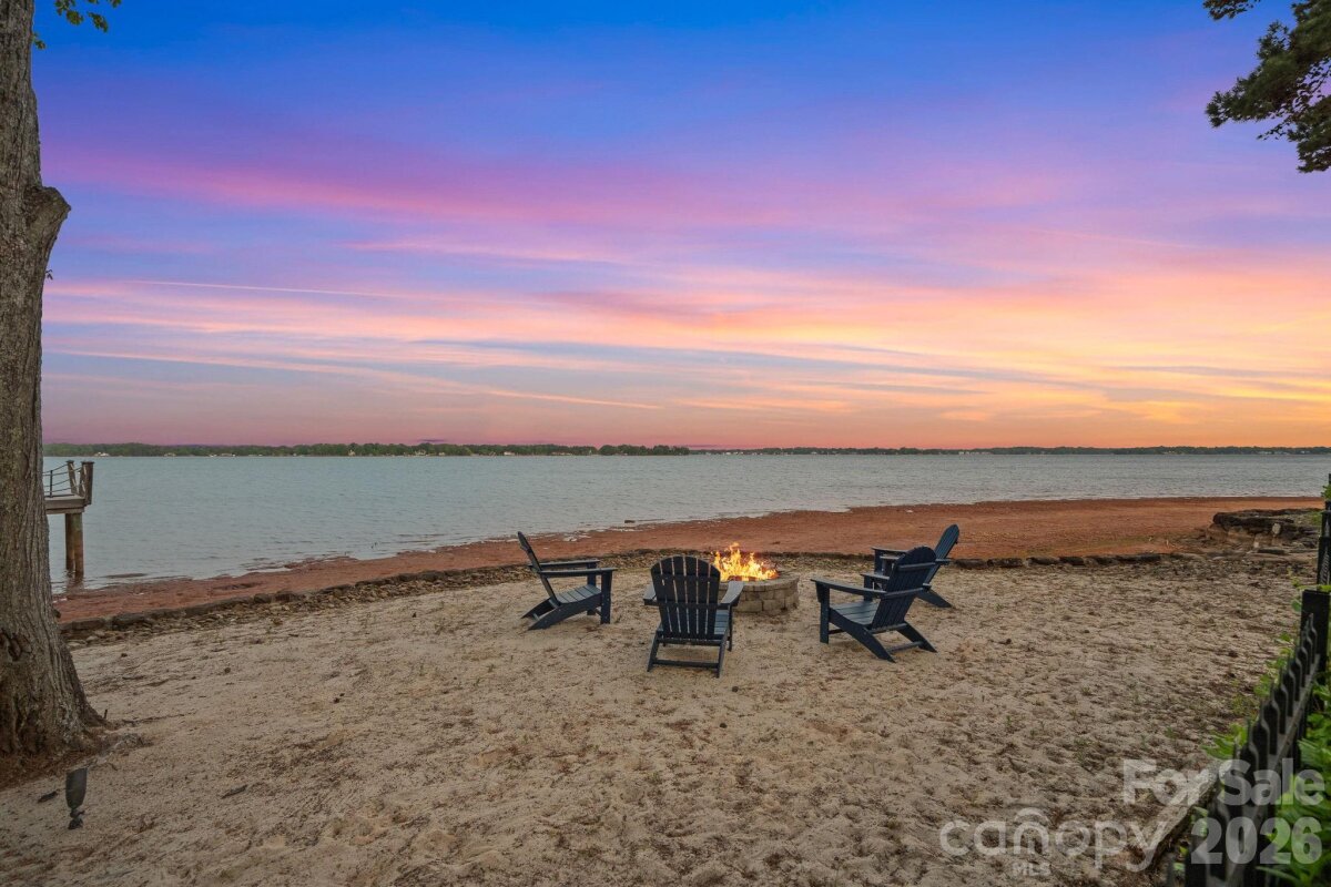 Set on approximately 1.48 private acres with approximately 450 feet of open, deep-water shoreline, 109 Conway Court is a rare waterfront estate located on one of The Point’s most coveted addresses. This architecturally significant residence offers an extraordinary combination of scale, craftsmanship, and lakefront living. A dramatic arrival begins with a cobblestone motor court and four-car attached garage, leading to a grand entry with a soaring two-story foyer featuring walls of glass and a striking custom circular staircase of wrought iron and wood. The home’s exterior is a timeless blend of brick, stone, wood, and stucco. The primary suite is a private lakeside sanctuary featuring a stone-surround fireplace, power blackout shades, cedar-lined walk-in closets, a private laundry room, and direct access to a waterfront patio. The spa-inspired bath includes radiant heated floors, freestanding soaking tub, luxe gold fixtures, marble vanities, Toto washlet, and designer lighting. Designed for both everyday living and large-scale entertaining, the gourmet chef’s kitchen features custom cabinetry by Impact Fine Design, exotic quartzite countertops, heated floors, two Bosch dishwashers, Miele coffee maker, and professional-grade appliances including Wolf and Sub-Zero refrigeration with multiple beverage drawers. Designer lighting curated from Visual Comfort completes the space. Entertaining spaces include a breathtaking two-story living room with custom bar opening to a covered waterfront patio, expansive great room with custom wood detailing, formal dining with butler’s pantry, temperature-controlled wine cellar (400–500 bottle capacity), and a second-level entertainment area with full bar and private lakefront terrace. Guest accommodations include four upper-level ensuite bedrooms, a richly detailed loft/library, and a separate approximately 675 sq ft waterfront guest house with full bath and steam shower. A private executive study on the third floor offers panoramic lake views through a curved wall of windows. Outdoor living is exceptional with a custom infinity pool and spa, private deep-water pier suitable for boats and PWCs, seawall, sandy beach, and expansive grounds that maximize open water views. An irreplaceable Lake Norman estate offering privacy, deep water, architectural distinction, and premier waterfront living within The Point.