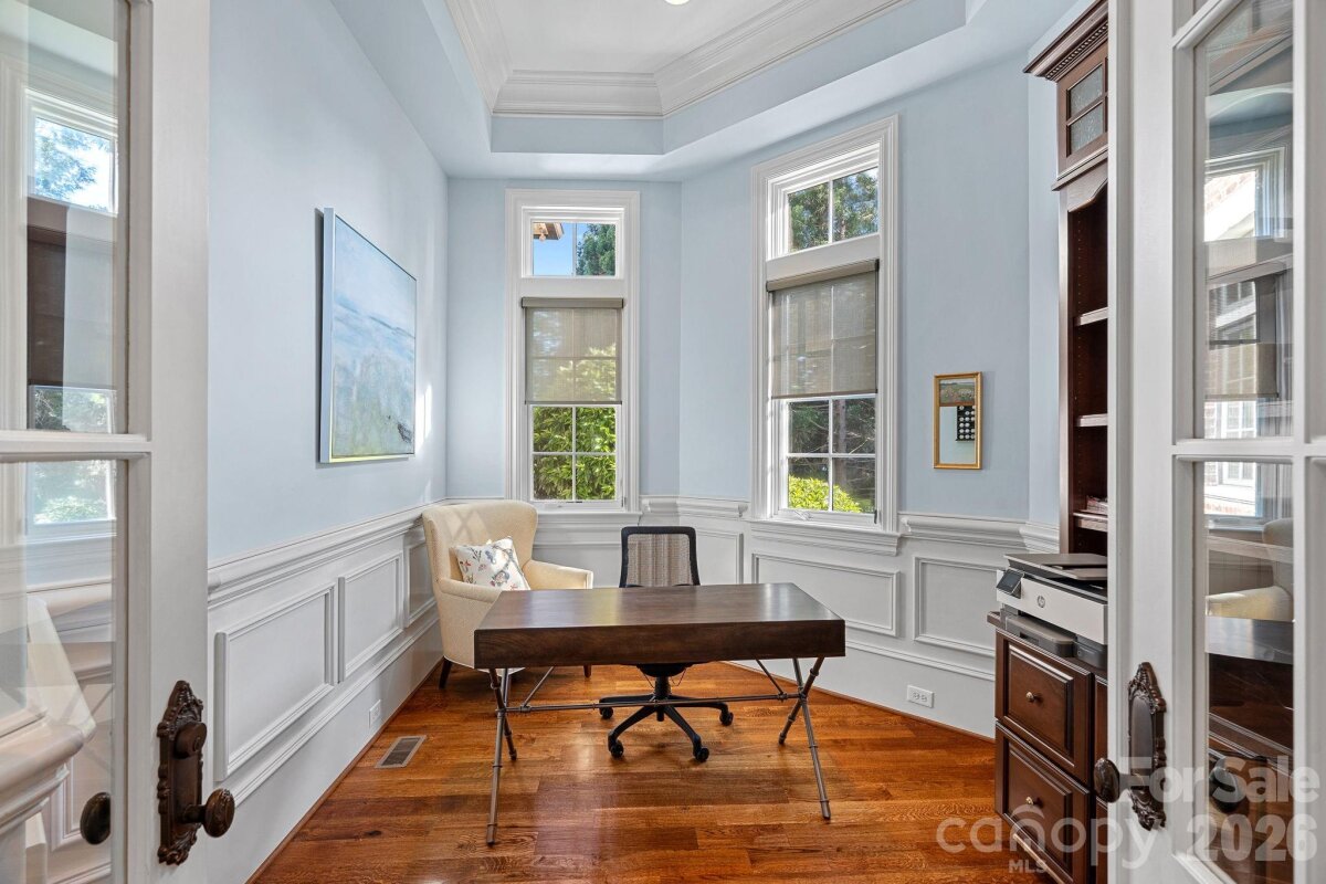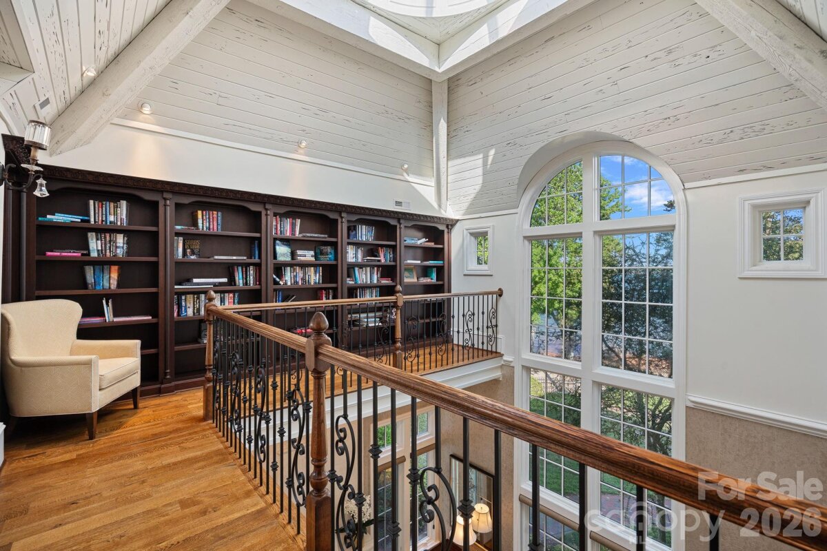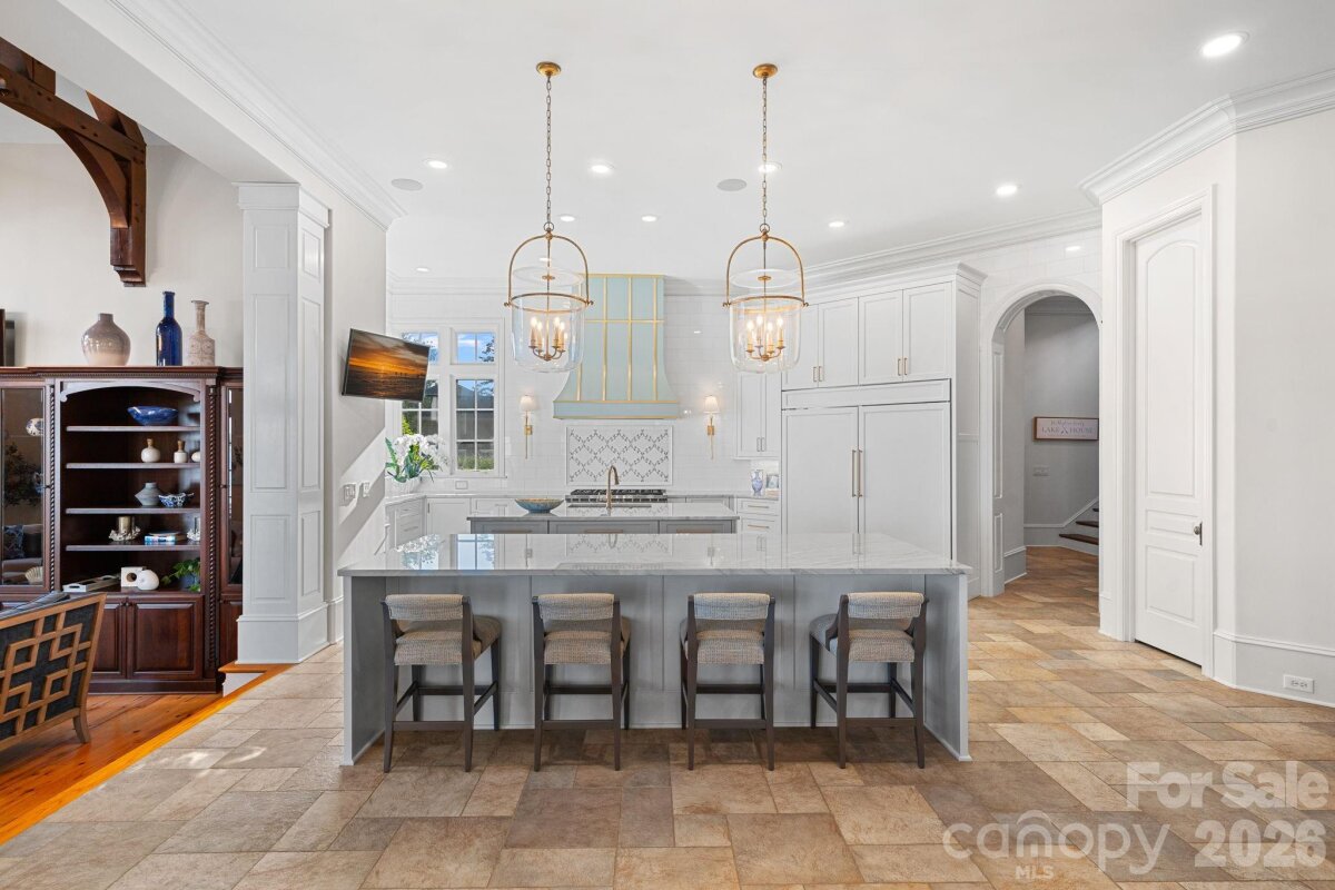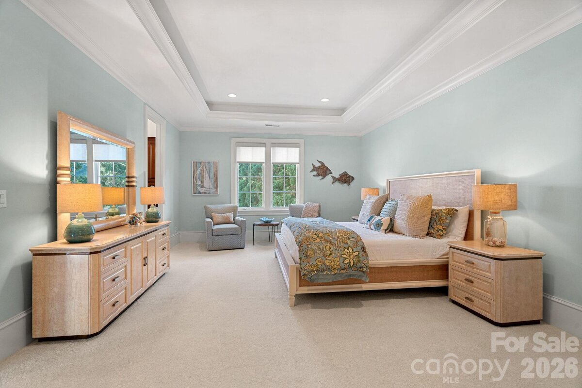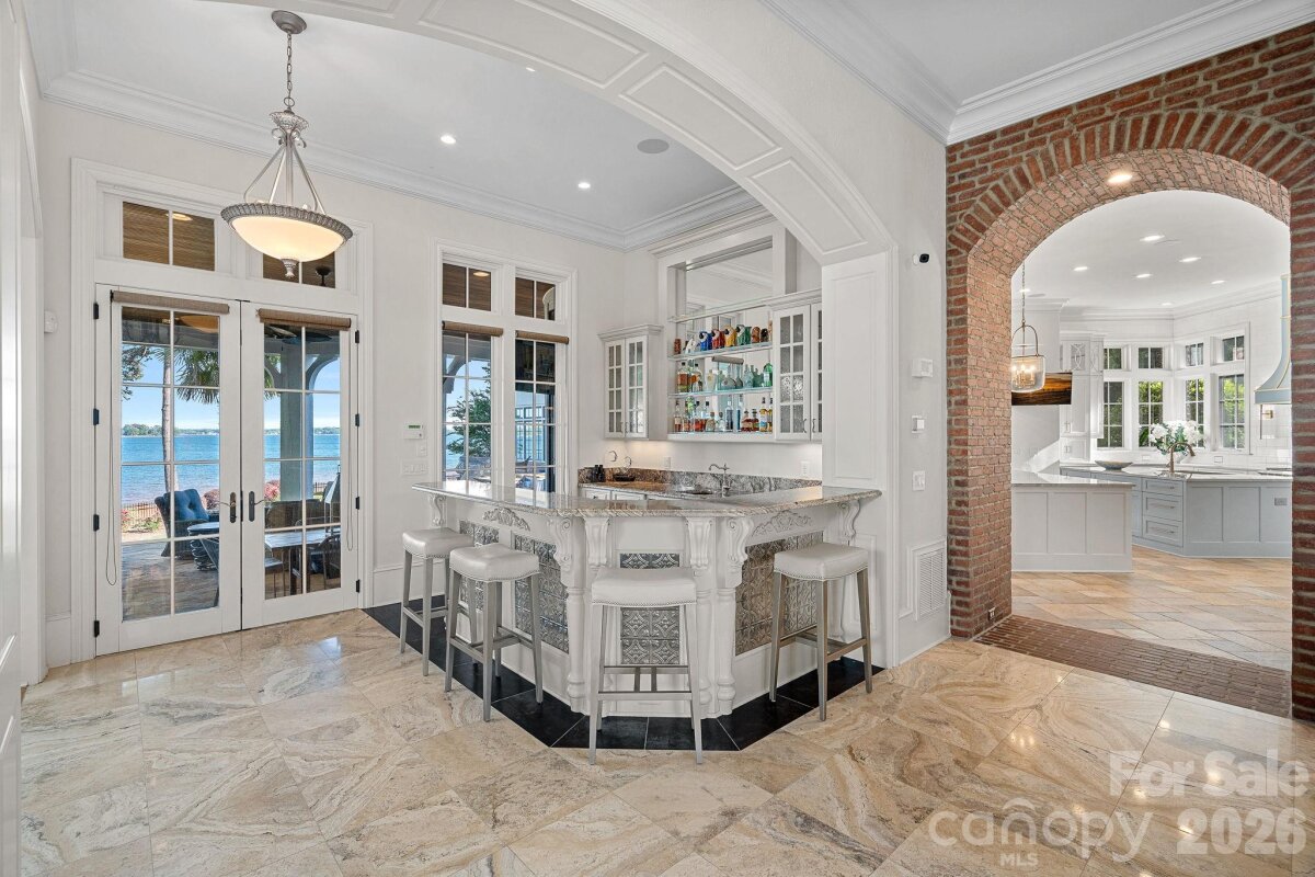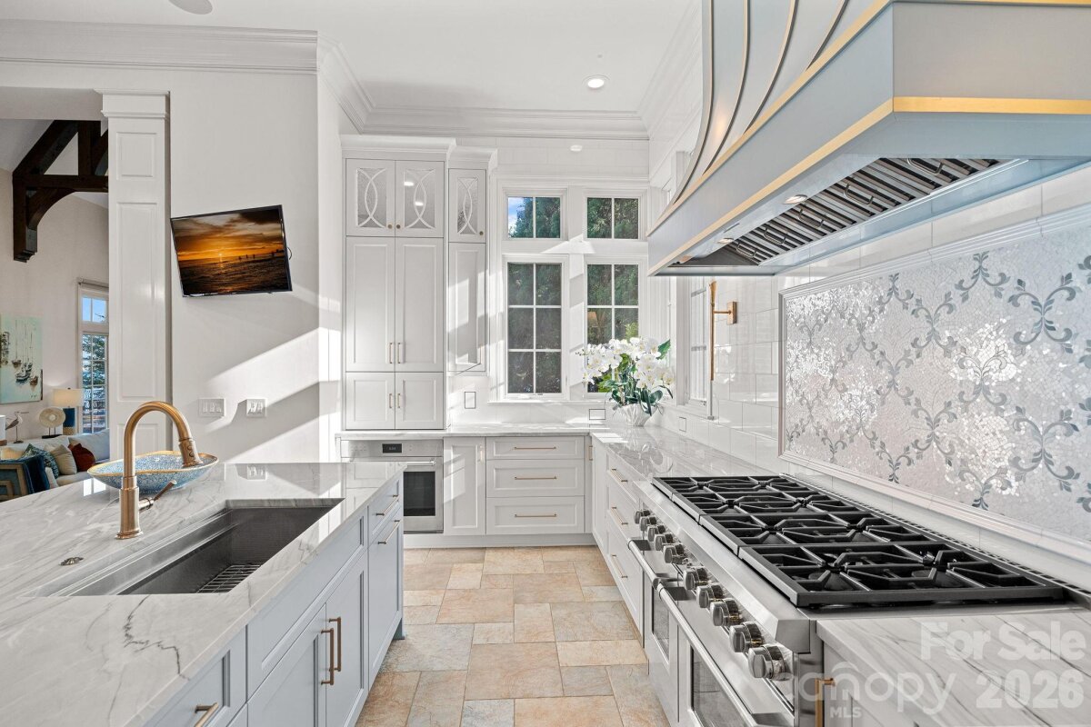 Set on approximately 1.48 private acres with approximately 450 feet of open, deep-water shoreline, 109 Conway Court is a rare waterfront estate located on one of The Point’s most coveted addresses. This architecturally significant residence offers an extraordinary combination of scale, craftsmanship, and lakefront living. A dramatic arrival begins with a cobblestone motor court and four-car attached garage, leading to a grand entry with a soaring two-story foyer featuring walls of glass and a striking custom circular staircase of wrought iron and wood. The home’s exterior is a timeless blend of brick, stone, wood, and stucco. The primary suite is a private lakeside sanctuary featuring a stone-surround fireplace, power blackout shades, cedar-lined walk-in closets, a private laundry room, and direct access to a waterfront patio. The spa-inspired bath includes radiant heated floors, freestanding soaking tub, luxe gold fixtures, marble vanities, Toto washlet, and designer lighting. Designed for both everyday living and large-scale entertaining, the gourmet chef’s kitchen features custom cabinetry by Impact Fine Design, exotic quartzite countertops, heated floors, two Bosch dishwashers, Miele coffee maker, and professional-grade appliances including Wolf and Sub-Zero refrigeration with multiple beverage drawers. Designer lighting curated from Visual Comfort completes the space. Entertaining spaces include a breathtaking two-story living room with custom bar opening to a covered waterfront patio, expansive great room with custom wood detailing, formal dining with butler’s pantry, temperature-controlled wine cellar (400–500 bottle capacity), and a second-level entertainment area with full bar and private lakefront terrace. Guest accommodations include four upper-level ensuite bedrooms, a richly detailed loft/library, and a separate approximately 675 sq ft waterfront guest house with full bath and steam shower. A private executive study on the third floor offers panoramic lake views through a curved wall of windows. Outdoor living is exceptional with a custom infinity pool and spa, private deep-water pier suitable for boats and PWCs, seawall, sandy beach, and expansive grounds that maximize open water views. An irreplaceable Lake Norman estate offering privacy, deep water, architectural distinction, and premier waterfront living within The Point.