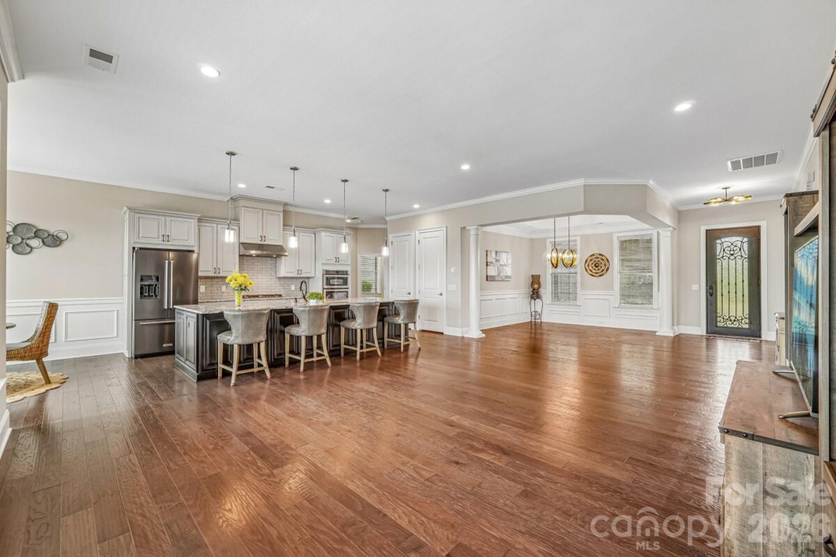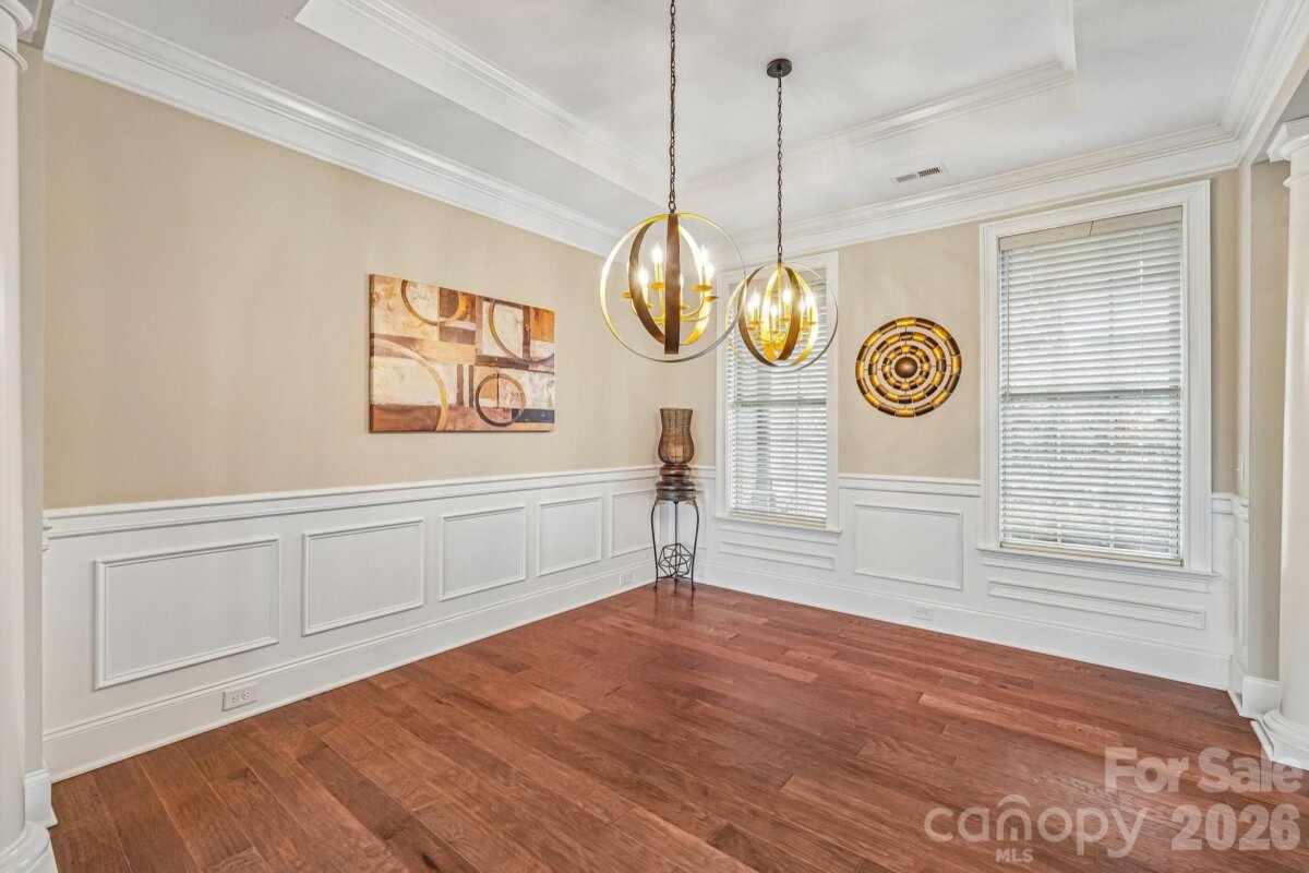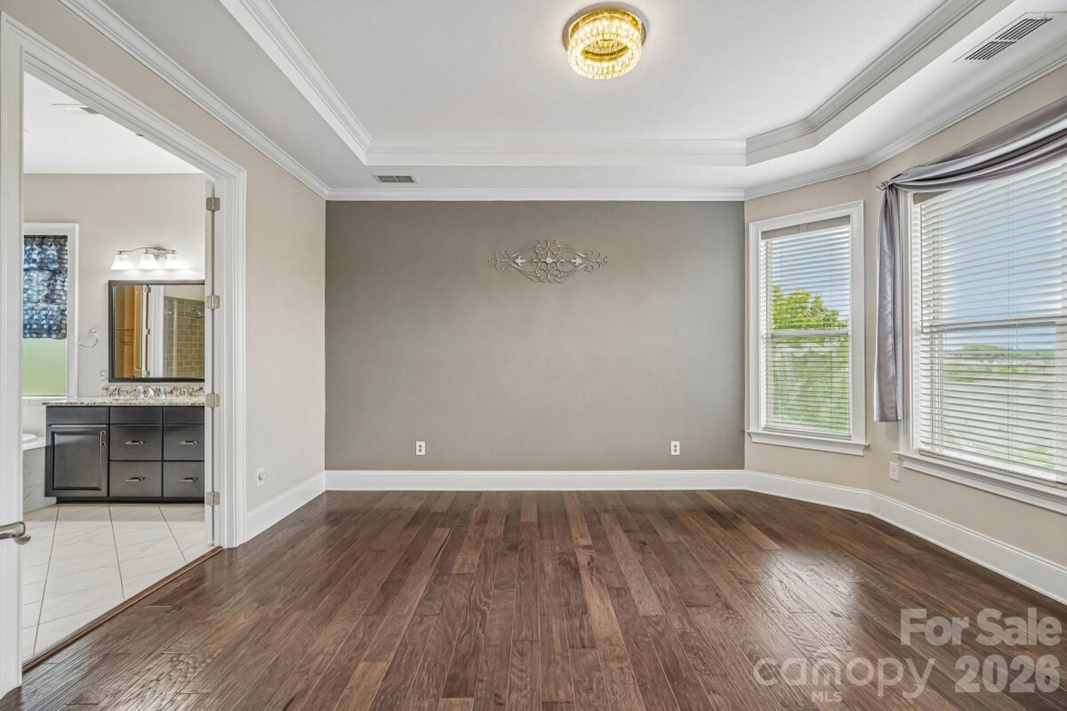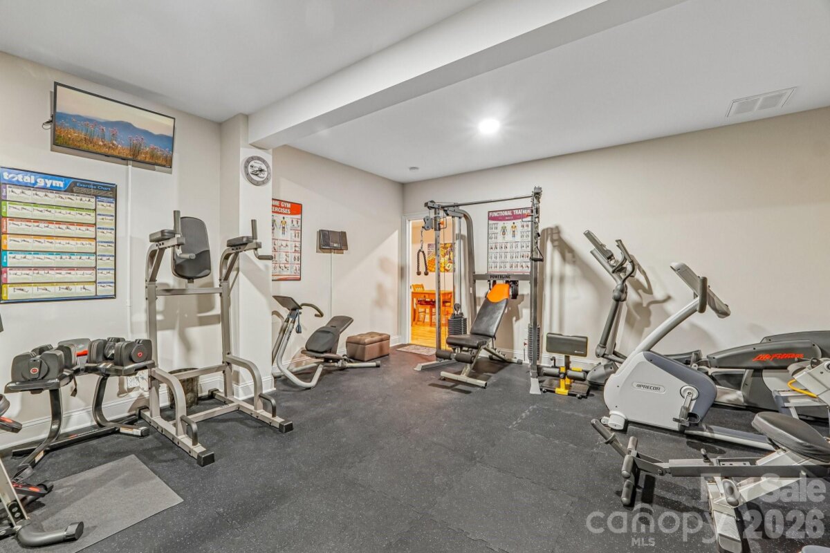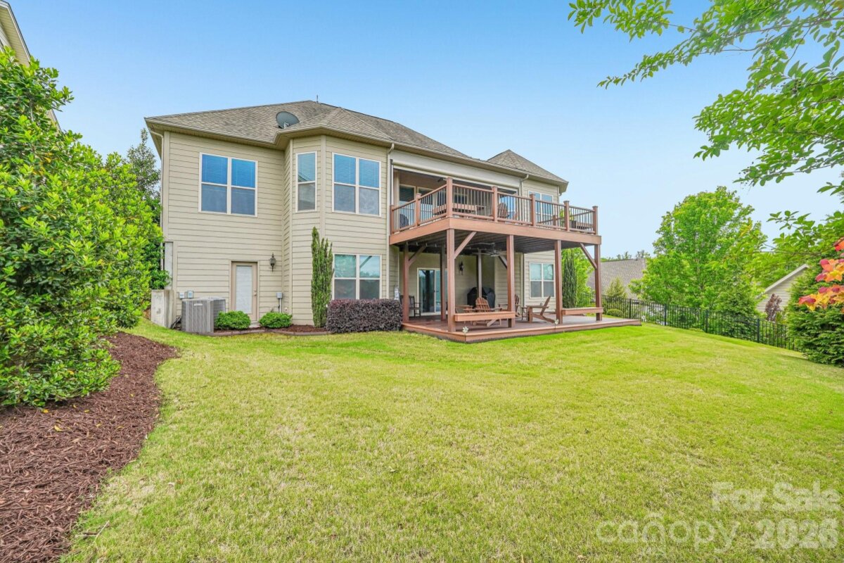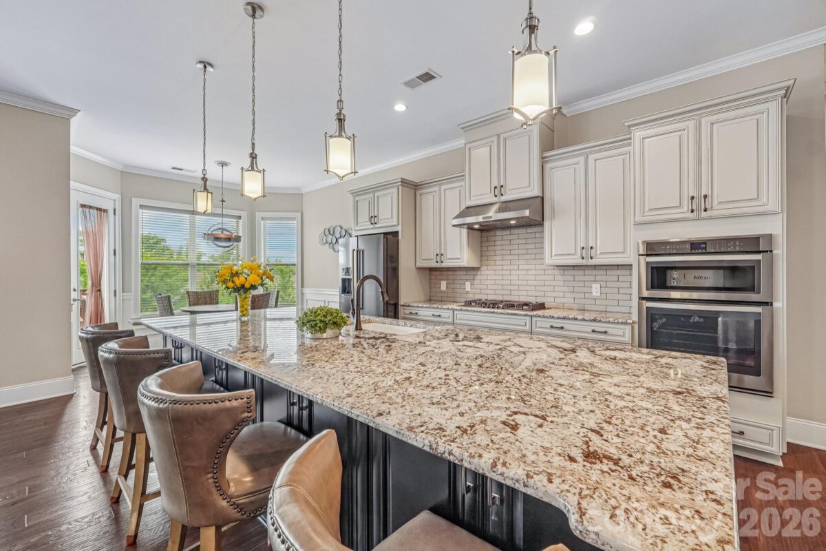 From the moment you enter through the custom-crafted front door, this exceptional cul-de-sac residence sets a tone of refined elegance. Rich hardwood floors, stately columns, intricate crown molding and wainscoting, custom wood blinds, and tray ceilings showcase the home’s impeccable attention to detail and timeless design. At the heart of the home, the gourmet kitchen is designed to impress, anchored by a stunning 12-foot granite island and complemented by abundant custom cabinetry. High-end appliances include a Bosch gas range with hood and a KitchenAid refrigerator. These pair beautifully with a classic subway tile backsplash and a farmhouse sink, creating a space that is as functional as it is sophisticated. The expansive primary suite offers a private retreat, featuring dual vanities, an oversized walk-in shower, a luxurious soaking tub, and a generously sized walk-in closet. The walkout lower level elevates the home’s versatility, offering 9-foot ceilings and a thoughtfully designed layout that can easily function as a second living quarters, ideal for multigenerational living, or as an exceptional space for guests, a private office, and entertainment. A well-appointed kitchenette with quartz countertops, custom cabinetry, sink, and built-in beverage cooler enhances the space, alongside a 2nd primary/guest bedroom with a full bath. A cedar walk-in closet with motion-activated lighting adds a distinctive touch of luxury. Designed for both wellness and leisure, the home includes a fully equipped gym with mirrored walls and durable rubber flooring. Outdoor living is equally inviting, with upper and lower Trex decks featuring built-in seating and overlooking a beautifully landscaped, serene backyard. Completing the property is a pristine two-car garage with epoxy flooring and substantial overhead storage. Generous storage solutions can be found throughout the home, ensuring both beauty and functionality at every turn.