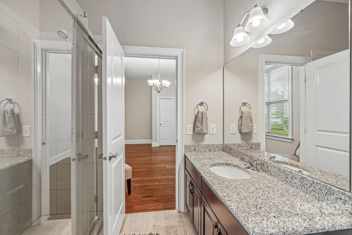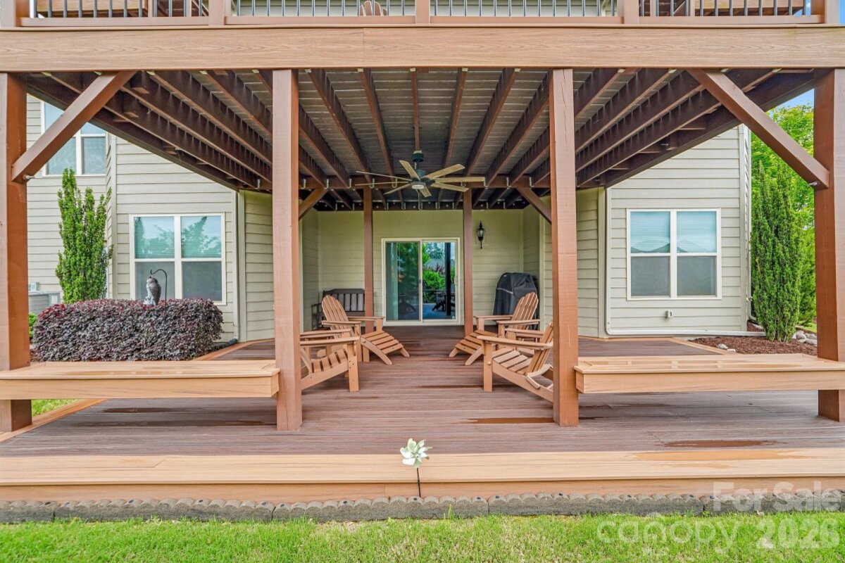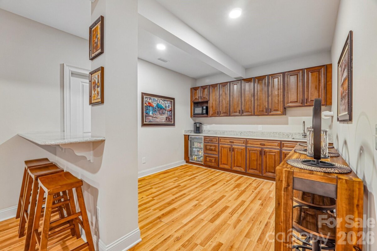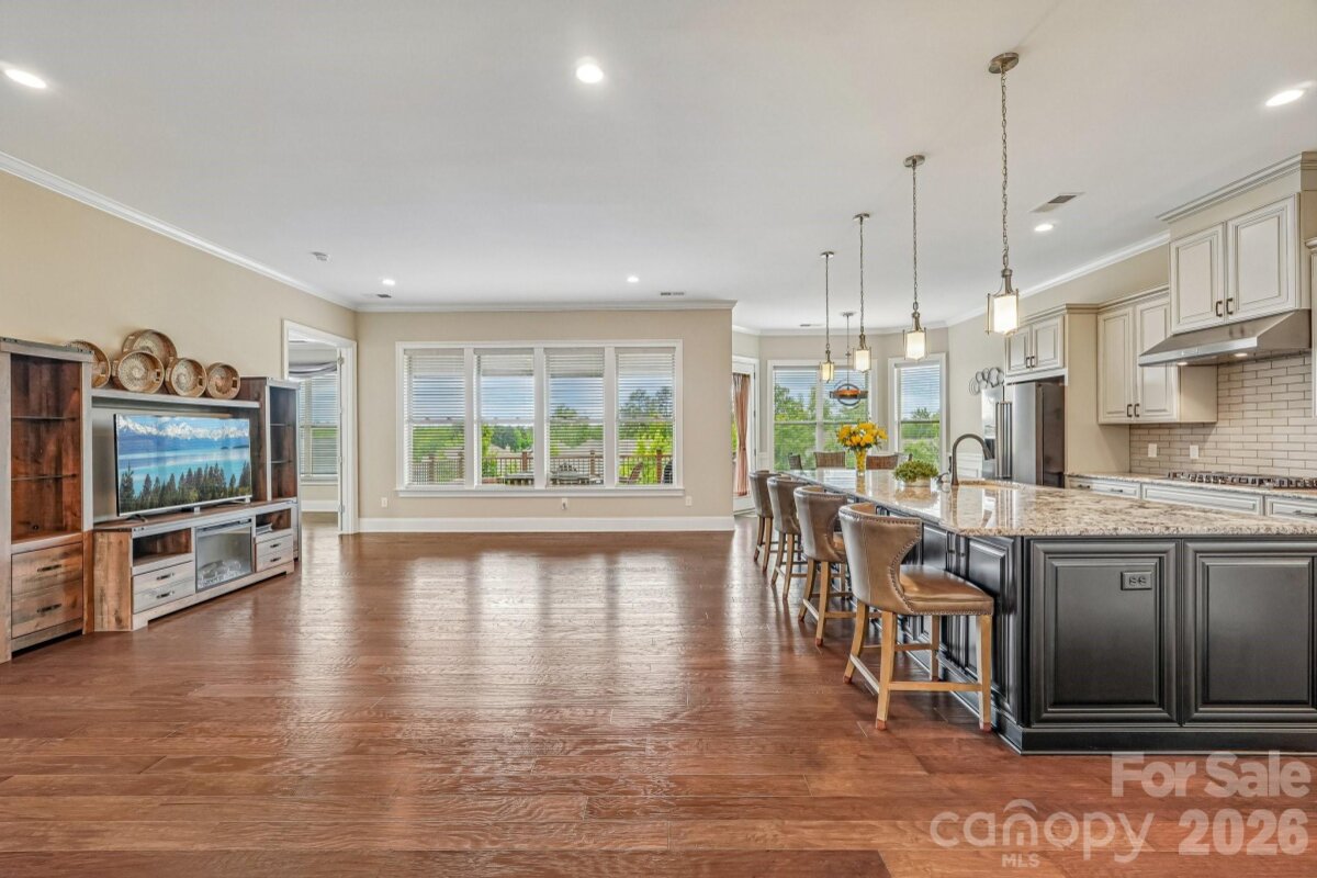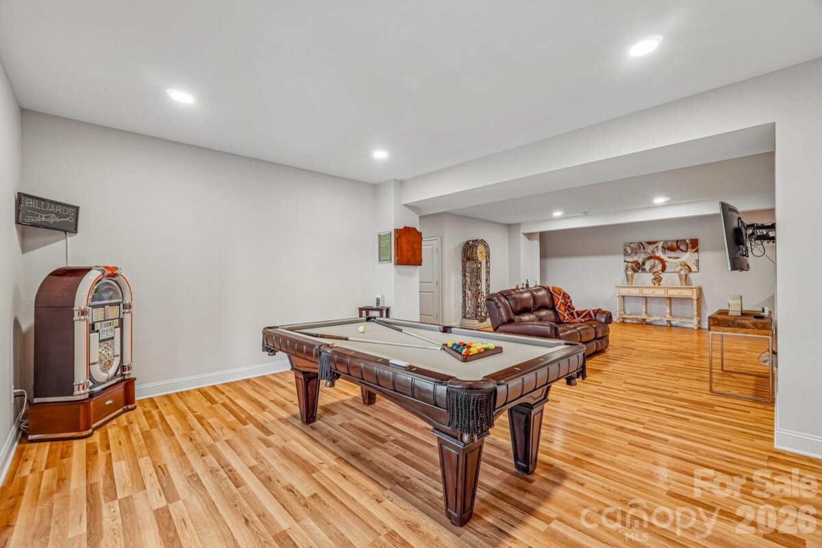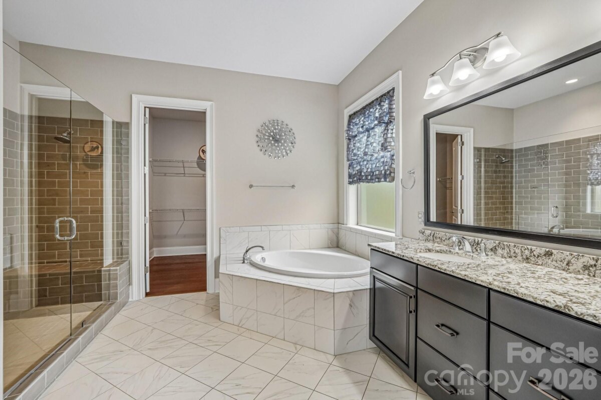 From the moment you enter through the custom-crafted front door, this exceptional cul-de-sac residence sets a tone of refined elegance. Rich hardwood floors, stately columns, intricate crown molding and wainscoting, custom wood blinds, and tray ceilings showcase the home’s impeccable attention to detail and timeless design. At the heart of the home, the gourmet kitchen is designed to impress, anchored by a stunning 12-foot granite island and complemented by abundant custom cabinetry. High-end appliances include a Bosch gas range with hood and a KitchenAid refrigerator. These pair beautifully with a classic subway tile backsplash and a farmhouse sink, creating a space that is as functional as it is sophisticated. The expansive primary suite offers a private retreat, featuring dual vanities, an oversized walk-in shower, a luxurious soaking tub, and a generously sized walk-in closet. The walkout lower level elevates the home’s versatility, offering 9-foot ceilings and a thoughtfully designed layout that can easily function as a second living quarters, ideal for multigenerational living, or as an exceptional space for guests, a private office, and entertainment. A well-appointed kitchenette with quartz countertops, custom cabinetry, sink, and built-in beverage cooler enhances the space, alongside a 2nd primary/guest bedroom with a full bath. A cedar walk-in closet with motion-activated lighting adds a distinctive touch of luxury. Designed for both wellness and leisure, the home includes a fully equipped gym with mirrored walls and durable rubber flooring. Outdoor living is equally inviting, with upper and lower Trex decks featuring built-in seating and overlooking a beautifully landscaped, serene backyard. Completing the property is a pristine two-car garage with epoxy flooring and substantial overhead storage. Generous storage solutions can be found throughout the home, ensuring both beauty and functionality at every turn.