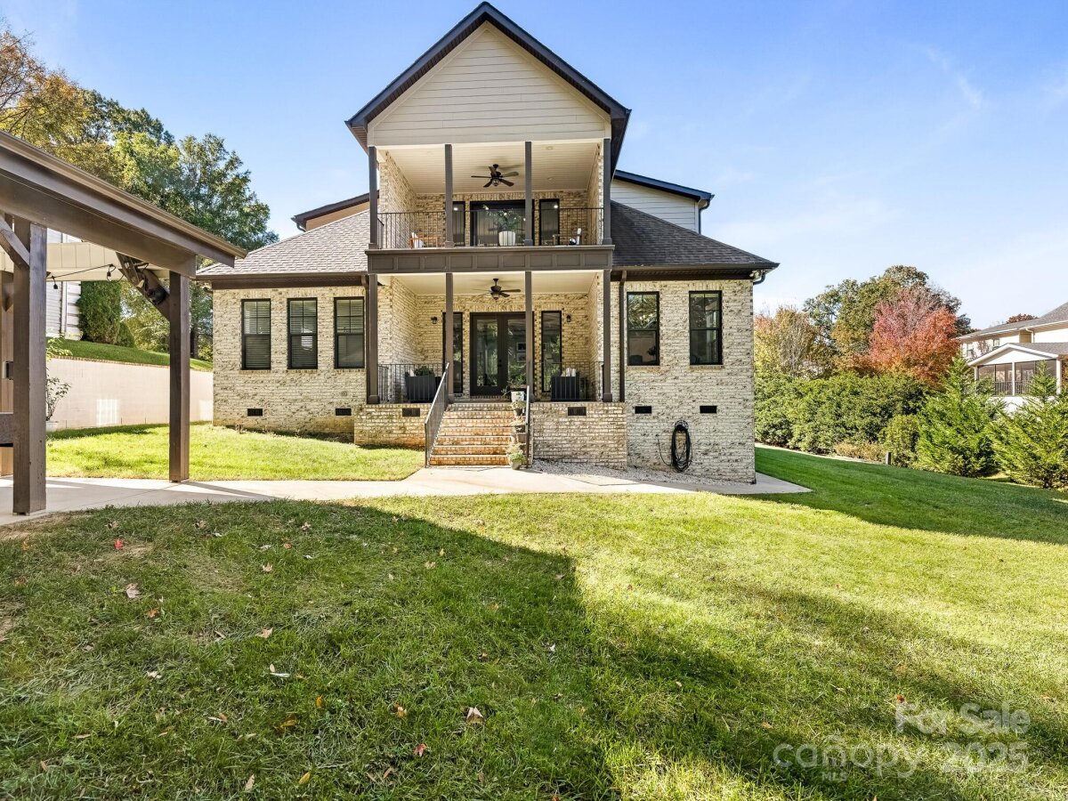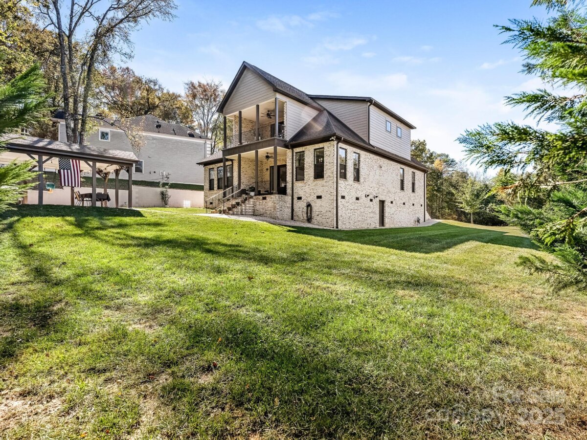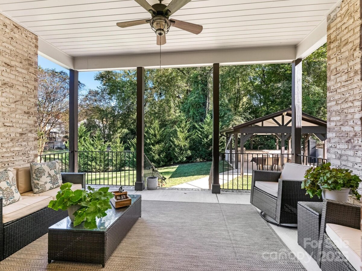 Traditional two-story light brick home combines classic architecture with modern open living spaces, enhancing natural light and creating an inviting atmosphere perfect for daily life and entertaining. The great room features a coffered ceiling, a Gas fuel fireplace with a marble-like porcelain surround, and access to the covered back porch overlooking the private backyard. The bright, open kitchen boasts an oversized seated quartz island with pendant lighting, under-cabinet lighting, Bosch stainless steel appliances, GE microwave, a dual-fuel range (gas cooktop and electric oven), a stainless pot-filler, quartz countertops, a light gray subway tile backsplash, and white cabinets with ample storage. The home includes two primary bedrooms plus two additional bedrooms and a bonus/bedroom. It has 4.5 bathrooms. White oak hardwood flooring runs throughout, complemented by modern lighting, quartz countertops and vanities, and marble tiles in the bathrooms. The rear of the home features two covered porches with ceiling fans and a gazebo with a brick-built-in gas grill and Bunsen burner, stainless steel built-in storage cabinets, and plenty of space for outdoor seating and dining furniture. The private backyard, with mature landscaping, is a great place to entertain or watch the deer and other wildlife. Tankless Water Heater, Gas furnace, Central Air, Trane Smart thermostat, Sealed crawlspace.