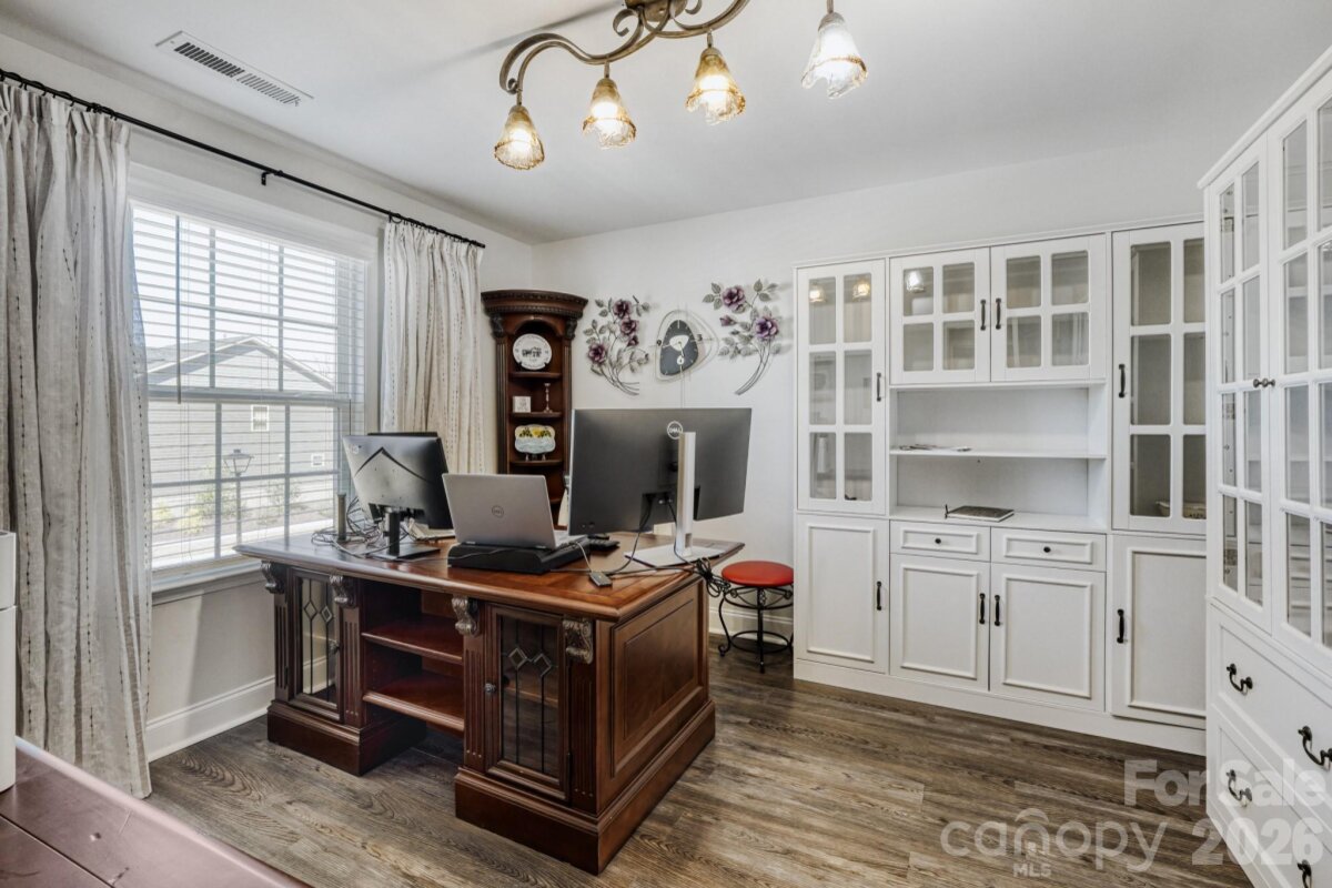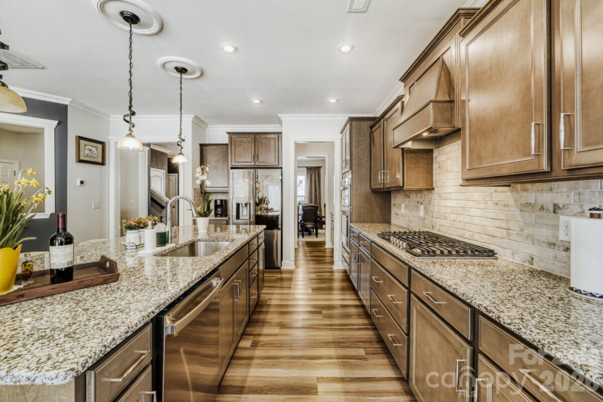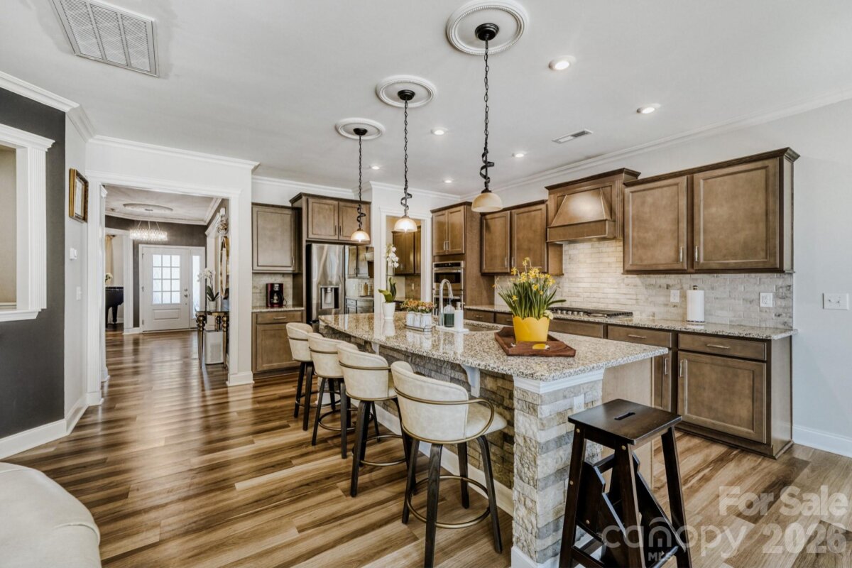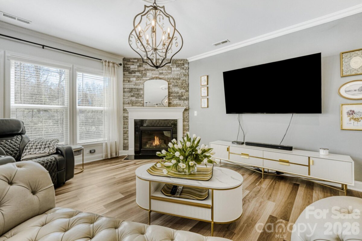 Welcome to 1318 Poppy Way, a beautifully upgraded residence in Matthews’ highly desirable Southstone community, where refined design, modern functionality, and everyday comfort come together with ease. Offering four bedrooms, two-and-a-half baths, and over 3,000 heated square feet, this buyer-ready home has been thoughtfully enhanced for effortless living. A charming front porch and attractive stone accents set the tone, while inside, luxury vinyl flooring flows throughout the home (no carpet), creating a seamless and sophisticated feel. Elegant lighting, decorative ceiling details, and generously scaled rooms elevate the interiors. The main level is designed for both gracious entertaining and comfortable daily living, featuring a formal dining room, a cozy formal living room (piano), and an expansive open-concept living area anchored by a warm corner fireplace. At the heart of the home, the gourmet kitchen impresses with rich cabinetry, an oversized granite island, new appliances, a gas cooktop, double ovens, a beautifully designed range hood, and a well-appointed butler’s pantry. Just beyond, the breakfast area opens naturally to the living spaces and rear patio, creating an inviting flow for casual gatherings and indoor-outdoor living. A thoughtfully designed drop zone with a built-in office adds convenience for modern routines, while a main-level powder room completes the first floor. Upstairs, a versatile loft and bonus room provide exceptional flexibility for a media lounge, playroom, or additional workspace. Four spacious bedrooms offer comfortable accommodations, including a serene primary suite designed as a true retreat. The spa-inspired primary bath features a large garden tub, dual vanities, and two oversized walk-in closets. A finished attic space/flex space further enhances the home’s versatility, allowing room to adapt beautifully to changing needs. Outside, the private backyard is framed by mature trees, offering a peaceful setting to relax or entertain. Additional highlights include an irrigation system, a finished garage with epoxy floors, shelving, and fresh paint, as well as a whole-house water filtration system. Ideally located near I-485, shopping, dining, and everyday conveniences, yet tucked within a quiet neighborhood, 1318 Poppy Way presents an exceptional opportunity to enjoy elevated living in one of Matthews’ most sought-after communities.
