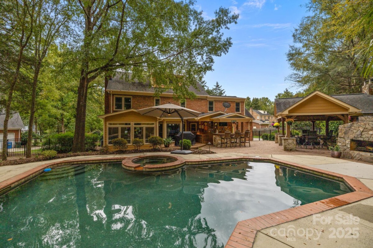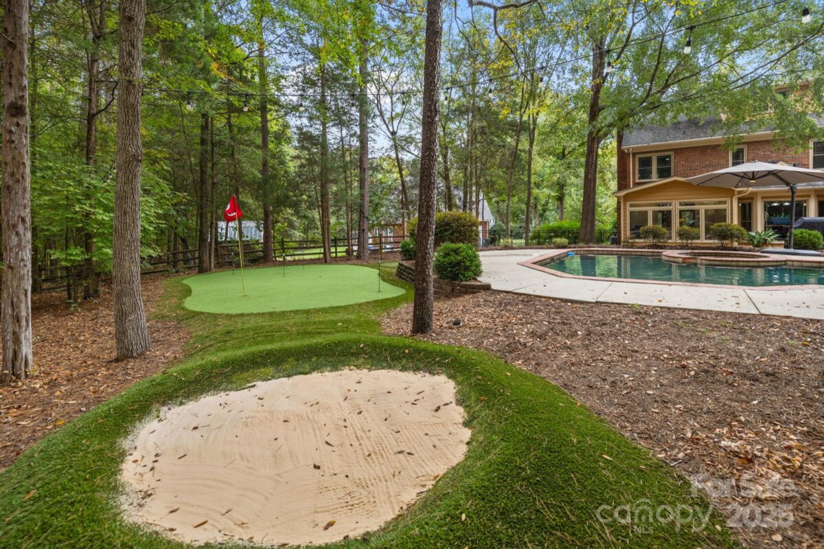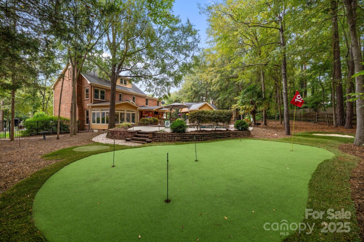 Beautiful full-brick custom home in popular Ashe Plantation! Who needs a vacation when you can enjoy resort-style living year-round? Nestled on over a half-acre cul-de-sac wooded lot, this 4-bedroom, 3.5-bath home offers privacy, space, and exceptional outdoor living. Relax by your private heated Pebbletec in-ground pool and spa, practice your short game on the built-in putting green, or unwind by one of two custom stone fireplaces in the outdoor living and dining areas. Watch the game from the outdoor bar and entertain with ease! Inside, site-finished hardwood floors flow throughout the main living areas, complemented by fresh paint and elegant finishes. The spacious formal dining room is perfect for gatherings, while the large living room with a gas log fireplace offers comfort and versatility. A bright 4 seasons sunroom overlooks the pool, blending indoor and outdoor living beautifully. The kitchen features rich stained cabinetry, granite countertops, and stainless steel appliances. The primary suite includes an updated bath and a walk-in closet. A generous bonus room is ideal for movie nights or play, while the third level provides a private retreat for guests or teens with its own bedroom, full bath, and bonus/flex space. Enjoy the fenced backyard, oversized driveway, storage shed and beautifully landscaped grounds designed for both entertaining and everyday enjoyment. Also! new windows 2023, new 2nd and 3rd level LVP flooring 2023, Exterior paint 2023, Interior paint 2025,