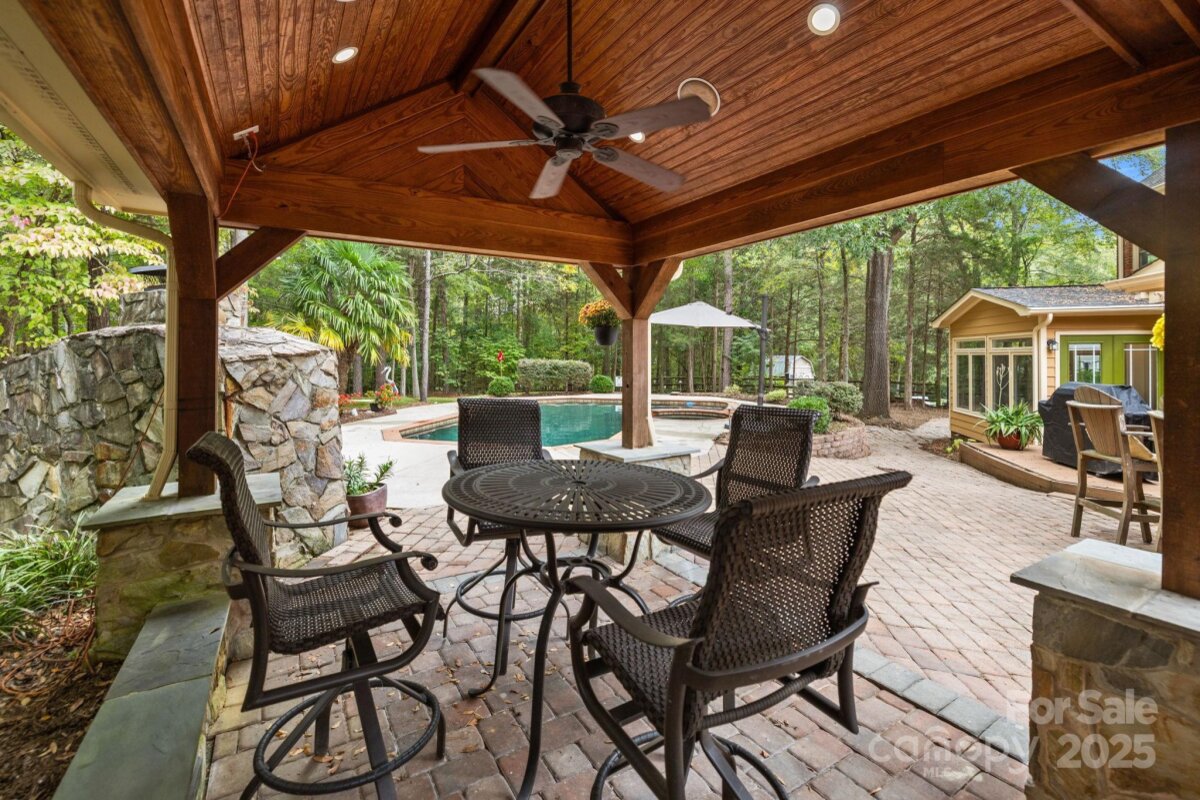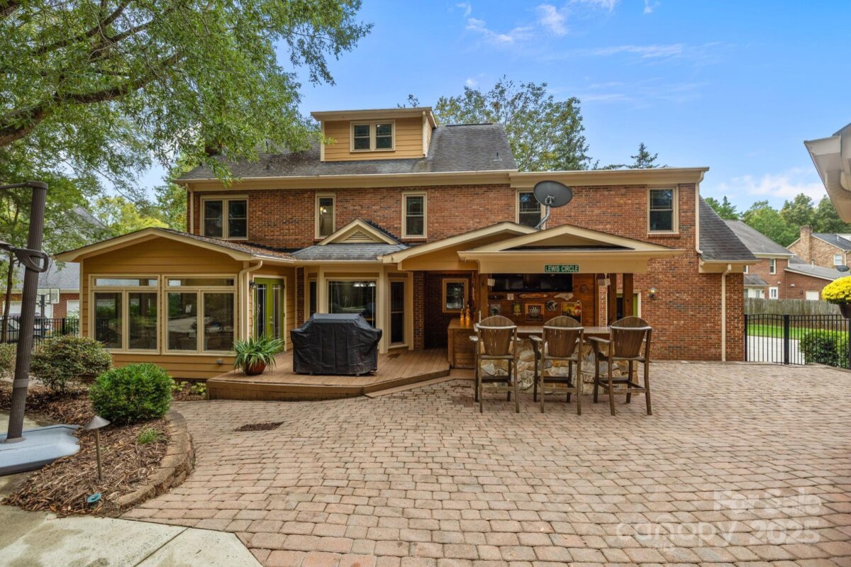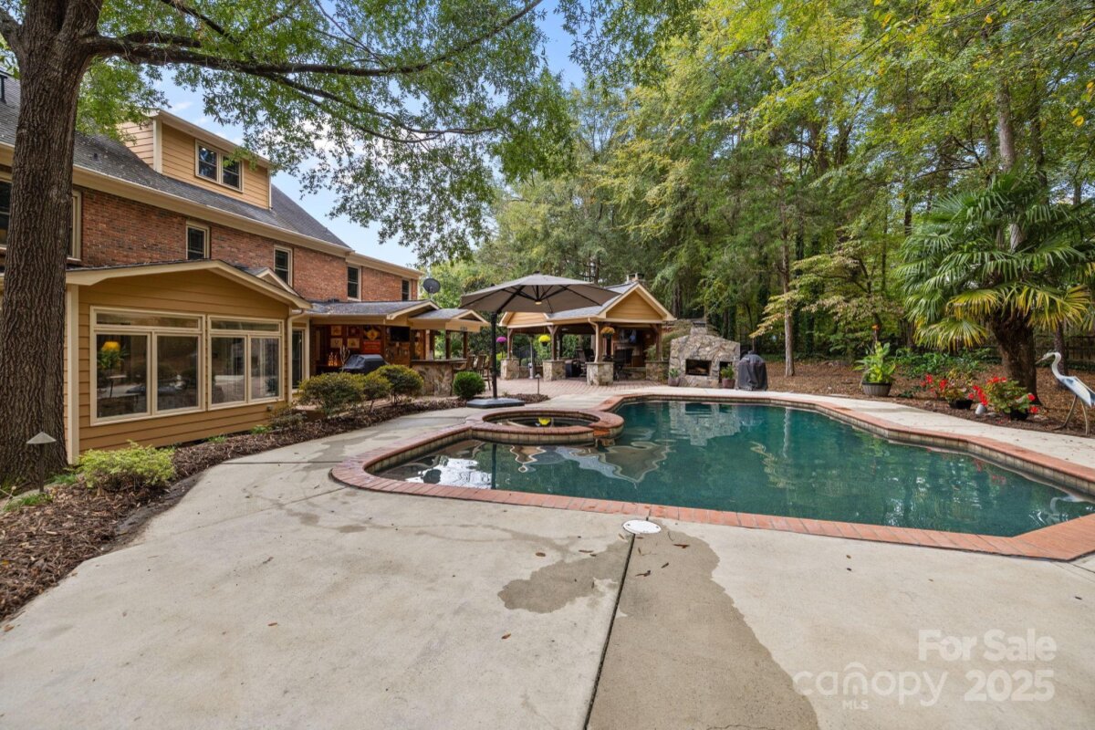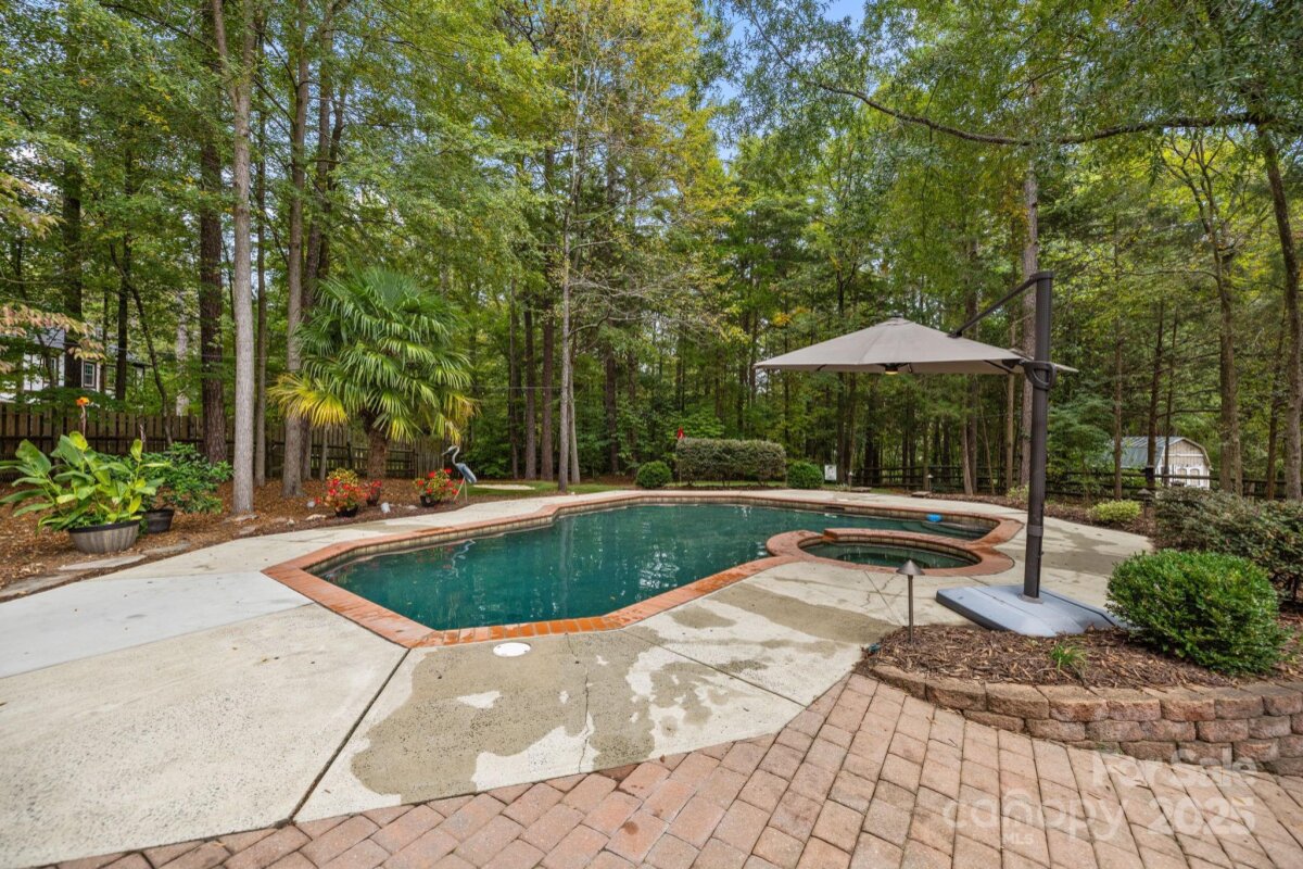 Beautiful full-brick custom home in popular Ashe Plantation! Who needs a vacation when you can enjoy resort-style living year-round? Nestled on over a half-acre cul-de-sac wooded lot, this 4-bedroom, 3.5-bath home offers privacy, space, and exceptional outdoor living. Relax by your private heated Pebbletec in-ground pool and spa, practice your short game on the built-in putting green, or unwind by one of two custom stone fireplaces in the outdoor living and dining areas. Watch the game from the outdoor bar and entertain with ease! Inside, site-finished hardwood floors flow throughout the main living areas, complemented by fresh paint and elegant finishes. The spacious formal dining room is perfect for gatherings, while the large living room with a gas log fireplace offers comfort and versatility. A bright 4 seasons sunroom overlooks the pool, blending indoor and outdoor living beautifully. The kitchen features rich stained cabinetry, granite countertops, and stainless steel appliances. The primary suite includes an updated bath and a walk-in closet. A generous bonus room is ideal for movie nights or play, while the third level provides a private retreat for guests or teens with its own bedroom, full bath, and bonus/flex space. Enjoy the fenced backyard, oversized driveway, storage shed and beautifully landscaped grounds designed for both entertaining and everyday enjoyment. Also! new windows 2023, new 2nd and 3rd level LVP flooring 2023, Exterior paint 2023, Interior paint 2025,