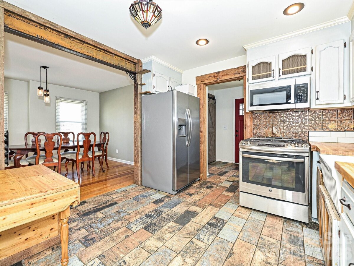 Welcome to this charming home in desirable Deertrack Mt Holly neighborhood! Large Great Room with wood burning fireplace and custom mantle machined from 150+ year old barn floor. Kitchen offers stainless steel appliances, gas range, farmhouse sink, butcher block countertop, tile backsplash and LED under counter lighting. Bay window with custom seat at breakfast nook. Side entry into mud room/drop zone. Formal Dining Room could be used as office. Large Primary Bedroom with walk in closet. Primary Bathroom features custom walk in shower with travertine tile and rain shower feature. Hall bathroom has claw foot bathtub. Both bathrooms and the Kitchen have faux wood tlle. Seller replaced the gas furnace in 2022 and gas water heater in 2021. Previous owners replaced the windows, front and back doors between 2016-2018. Covered Rear deck overlooking large wooded fenced backyard. Fire pit seating area and storage shed. No HOA!