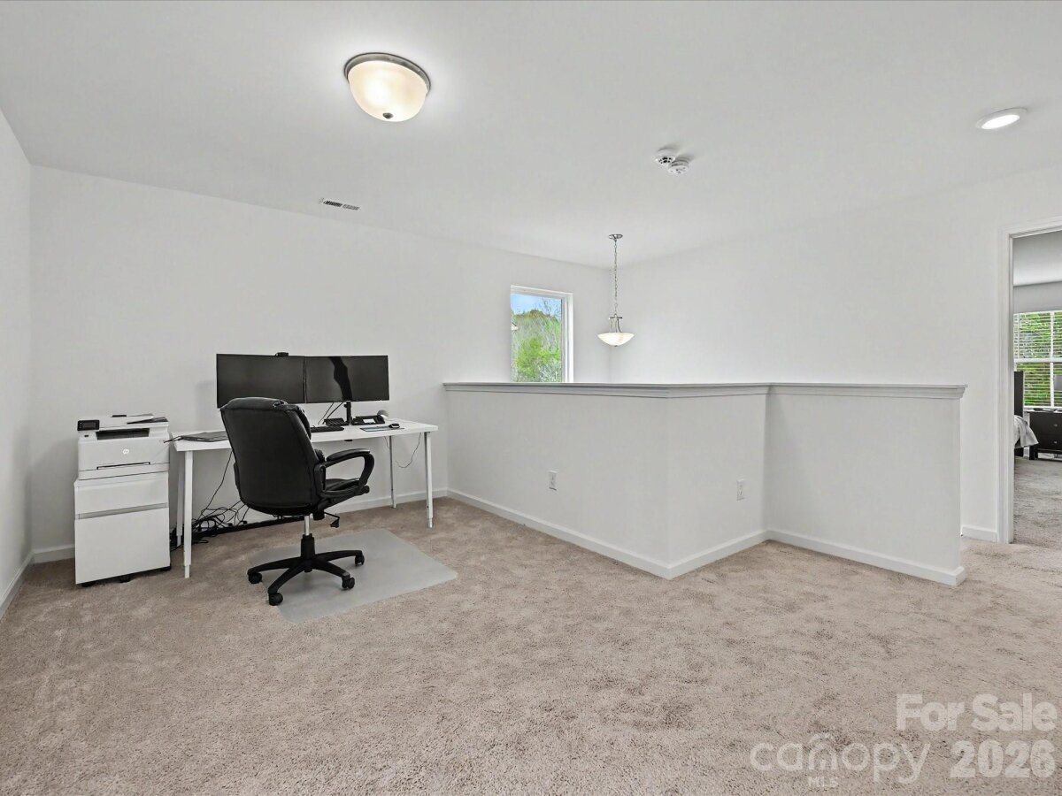 Beautifully designed two-story home offering a perfect blend of style, comfort, and functionality with thoughtfully curated living spaces throughout. An inviting covered front porch welcomes you into a bright entryway and spacious foyer with durable flooring, leading to a versatile flex room ideal for a home office or sitting area. The open-concept main living area features a spacious family room with abundant natural light and surround sound with seamless flow into the dining area and upgraded kitchen, complete with granite countertops, stainless steel appliances, modern cabinetry, tile backsplash, a large center island with seating, and stylish pendant lighting—perfect for everyday living and entertaining. A convenient drop zone with built-in bench and hooks adds organization near the staircase to the upper level. Upstairs, a generous loft provides additional living space ideal for a media room, playroom, or secondary office. The expansive primary suite offers plush carpeting, abundant natural light, and a private en-suite bath featuring dual vanities, a tiled walk-in shower, and a large walk-in closet. Secondary bedrooms are well-sized with ample natural light and share a full bath with a tub/shower combination and neutral finishes. A dedicated laundry room with overhead shelving adds everyday convenience. Outdoor living is equally impressive with an expansive paver patio featuring string lighting and seating space, all overlooking a spacious backyard—perfect for entertaining, relaxing, or play. This home combines modern design, flexible living spaces, and inviting indoor-outdoor flow, making it an exceptional place to call home.