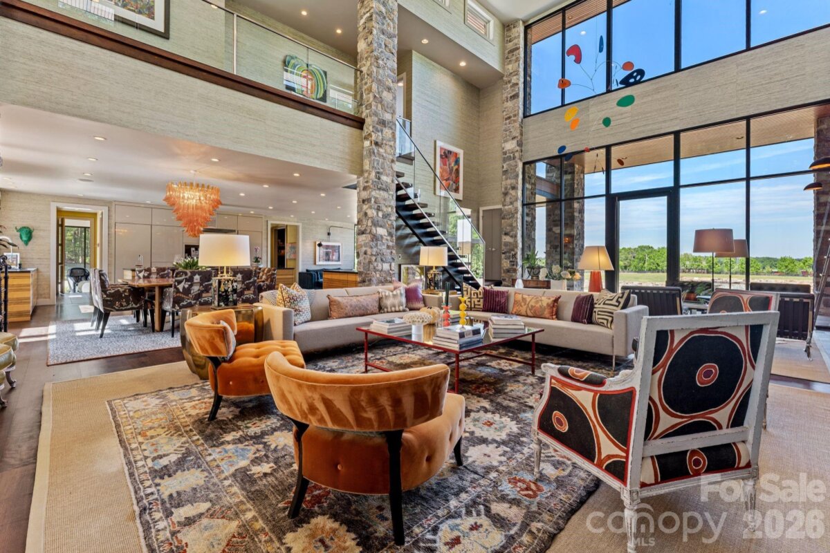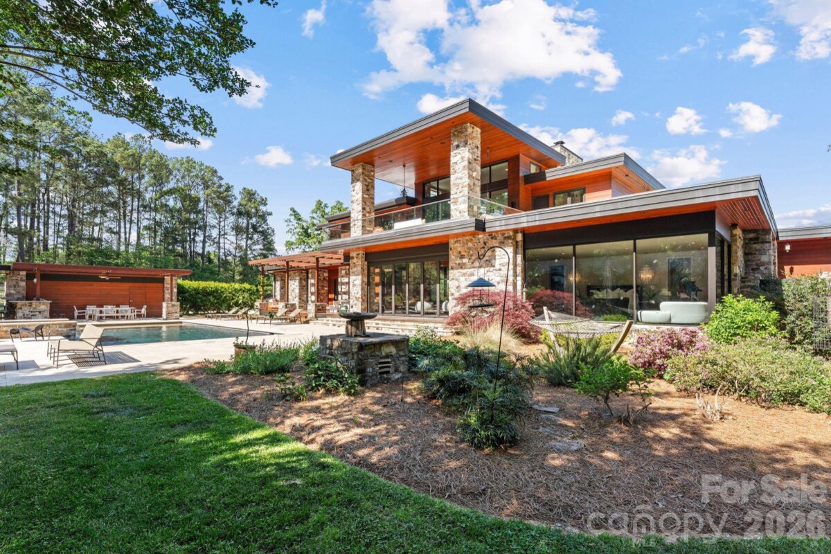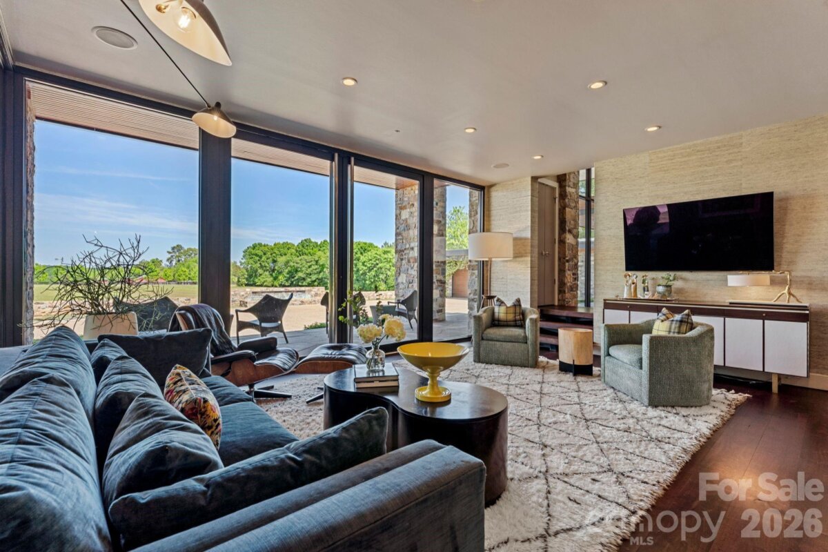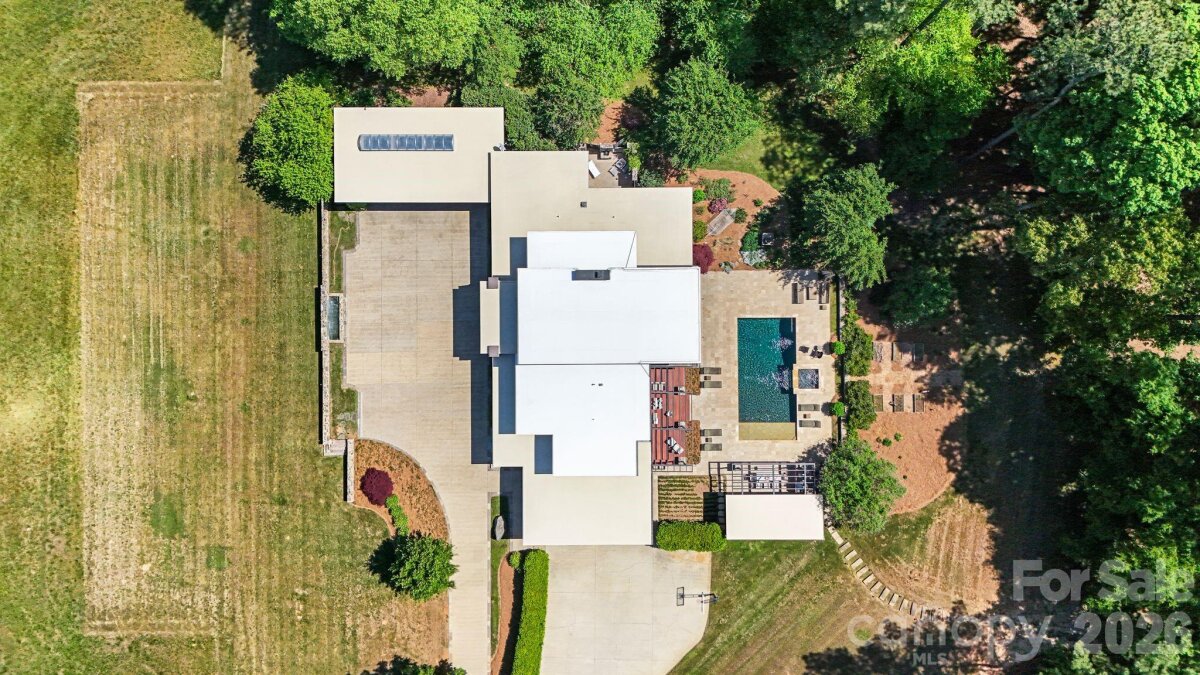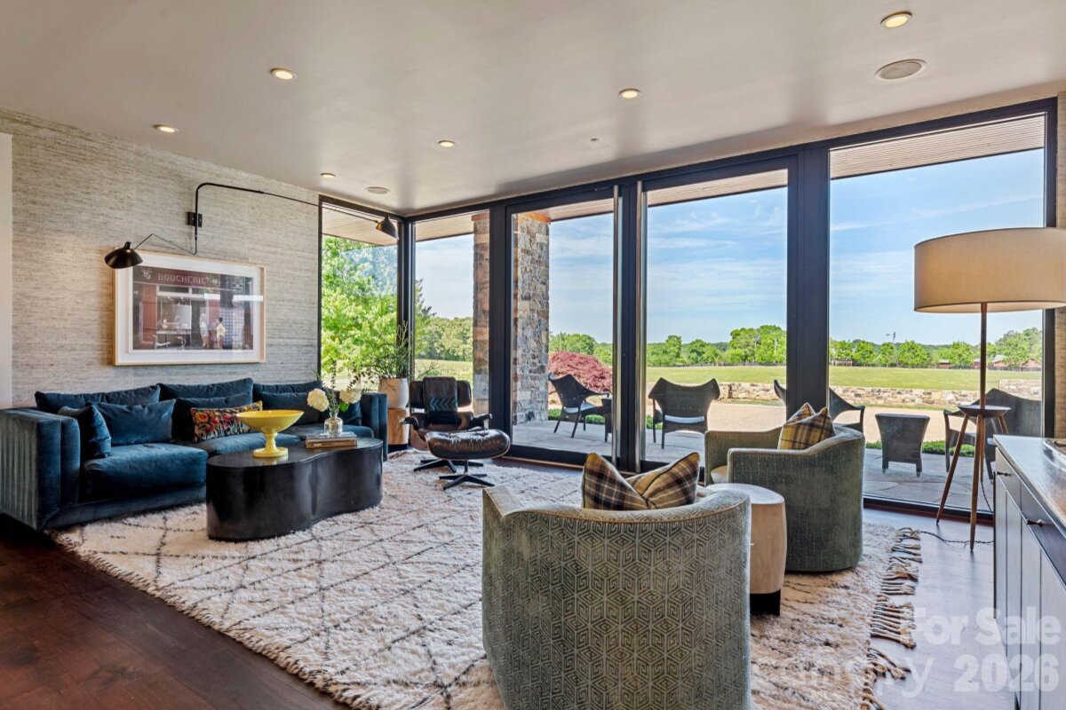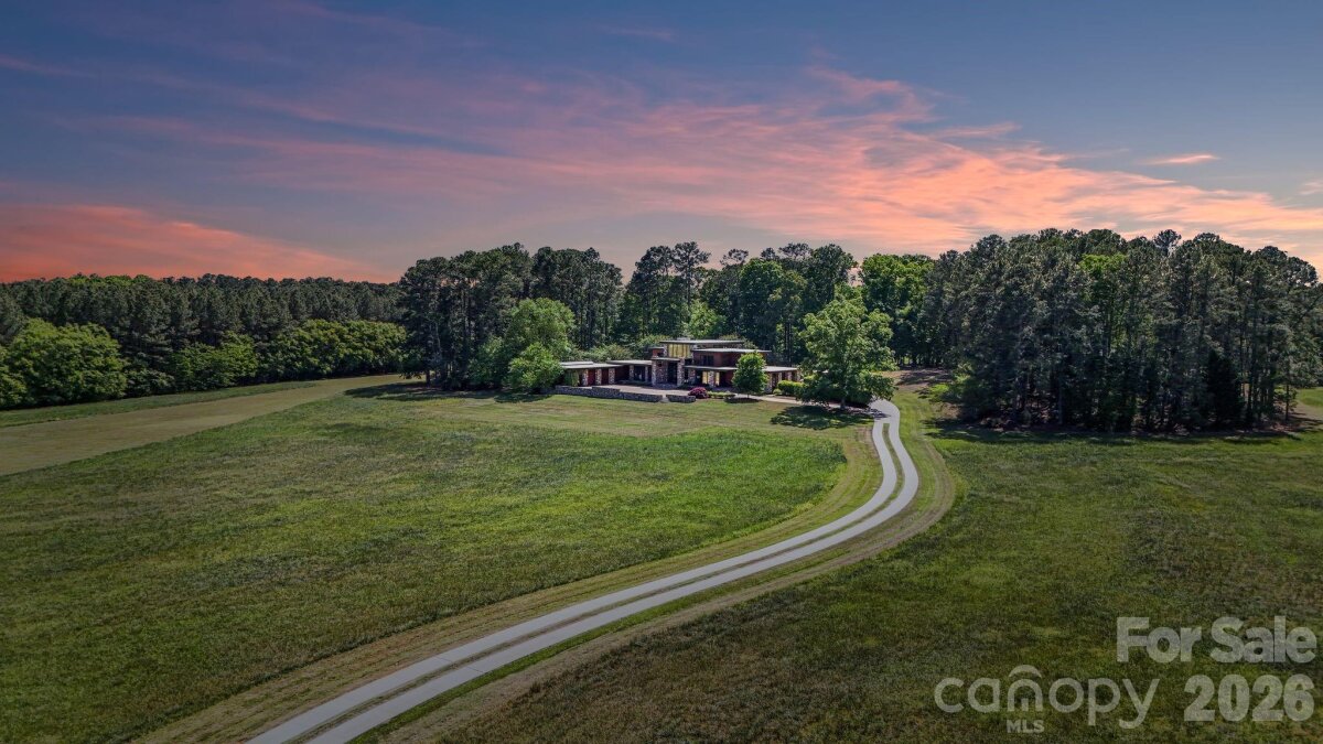 THE RANCH AT FAIRES RD: A Modern Equestrian Estate. Set quietly beyond the pace of Charlotte, this 75+ acre modern ranch estate offers a rare expression of architectural intention and landscape harmony. Conceived by Frank Smith after years of immersive study in contemporary design, and brought to life with interiors by Barrie Benson and craftsmanship by Kingswood Custom Homes, the home is both a personal retreat and a considered work of modern architecture. The approach is deliberate—a sweeping motorcourt, anchored by a sculptural fountain, sets a tone of understated grandeur. Inside, the residence unfolds through volumes of glass and stone, where light becomes a defining material. Floor-to-ceiling storefront windows and pivoting glass doors dissolve the boundary between interior and landscape, opening to a composition of water, sky, and rolling acreage. At the heart of the home, materials are both tactile and restrained—wide-plank black walnut floors, flamed leathered granite, and precision-crafted cabinetry that reveals itself at the touch. A curated Miele kitchen suite balances performance with quiet elegance, designed as much for gathering as for function. The primary suite is conceived as a private pavilion, complete with a steam shower and an intimate outdoor bathing terrace—an experience that invites stillness and connection to the surrounding landscape. Beyond the walls, the estate unfolds as an immersive environment. A heated pool with integrated current system allows for both leisure and training, while a private pond—stocked for bass and brim fishing—reflects the changing light of day. A driving range introduces a refined recreational element, complemented by expansive acreage suited for skeet shooting, four-wheeling, and dirt biking along established trails. Thoughtfully integrated into the landscape, the property offers a dynamic outdoor lifestyle—equally suited for quiet moments in nature and more active pursuits across the land. The equestrian component is equally considered, designed to resonate with discerning equestrians and those drawn to a refined rural lifestyle. A well-appointed barn serves as both a functional working stable and a natural extension of the estate, offering four stalls, a dedicated tack room, and lofted hay storage for efficient daily operation. A covered equipment shed provides seamless access to vehicle storage and groundskeeping implements, supporting the stewardship of the land. The surrounding acreage lends itself naturally to multiple fenced pastures and paddocks, allowing for thoughtful rotation, while rolling terrain and open sightlines create an ideal setting for private riding trails—suited for both leisurely rides and more focused training within the privacy of the estate. Enhancing the experience, the barn also incorporates a gym and a thoughtfully appointed kitchen and outdoor lounge space with fire pit, allowing for an effortless transition between training, care, and relaxation. Integrated technology—via a Savant whole-home system—operates discreetly in the background, orchestrating lighting, climate, and security with precision. A Generac generator, underground propane reserves, and whole-home water filtration reinforce a sense of self-sufficiency. An additional guest house, offered as-is, presents an opportunity for further personalization. Located within convenient reach of Charlotte, yet intentionally removed from its immediacy, this estate offers a compelling duality: accessibility and escape. It is a place defined not only by its design, but by the experience it creates—quiet, expansive, and enduring.