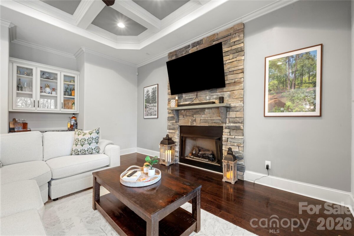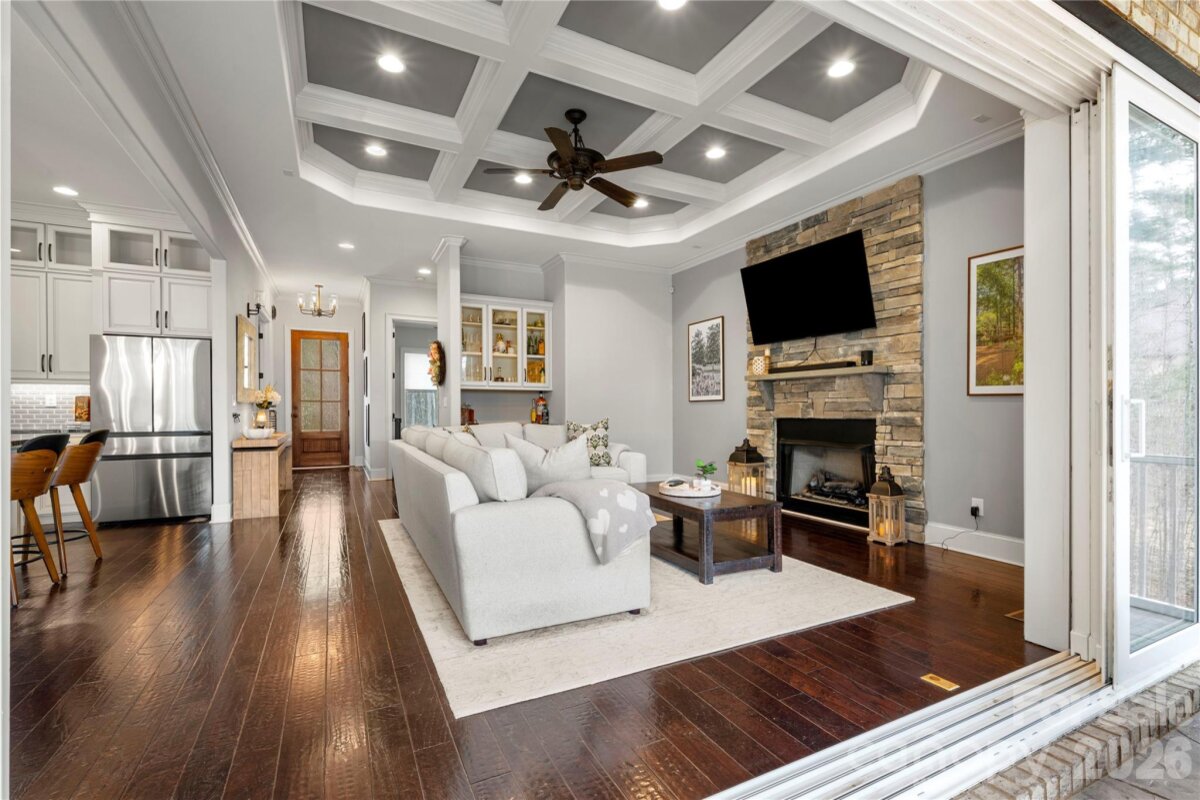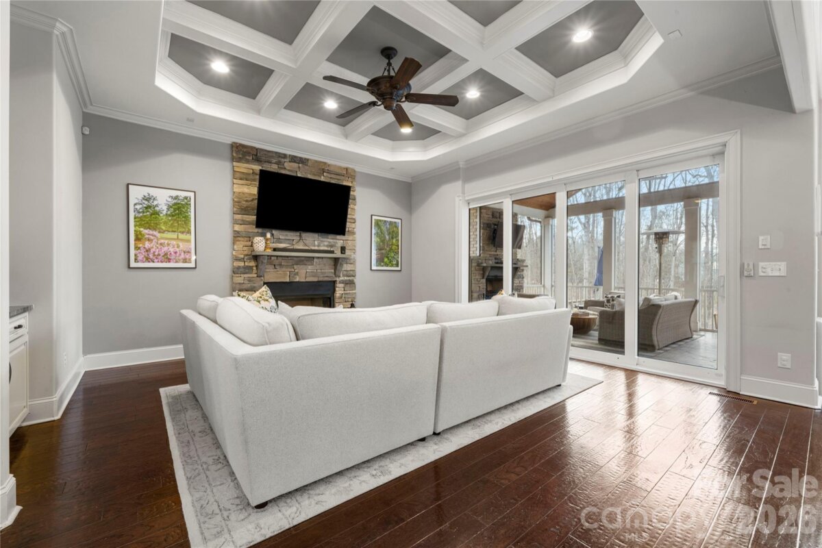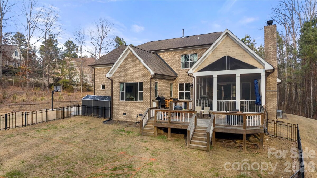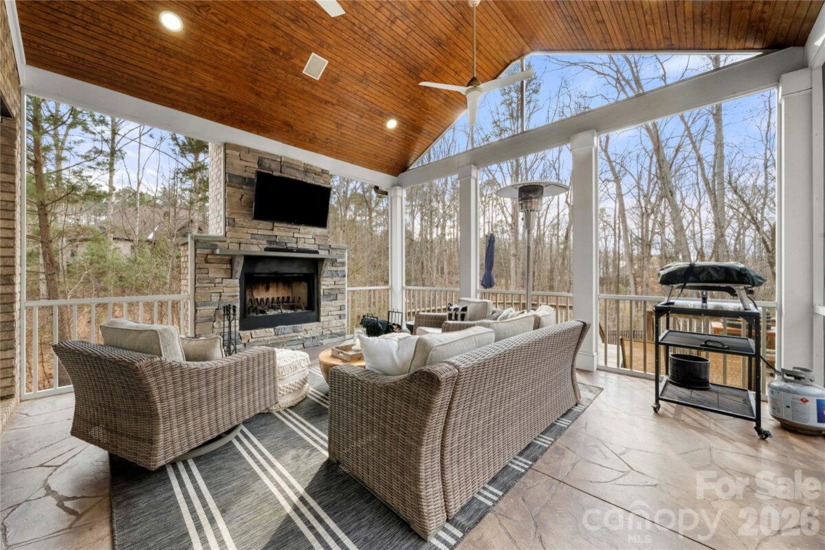 Beautifully crafted country-style home with manicured landscaping and a deep rocking-chair front porch that welcomes you in. This custom-built residence is filled with thoughtful details, including coffered ceilings in the great room and a stunning stone fireplace that anchors the space. The gourmet kitchen features glass-front custom cabinetry with interior lighting, a granite-topped island, classic subway-tile backsplash, and a gas cooktop perfect for everyday cooking or entertaining. The main-level primary suite offers a true spa-like retreat with a frameless walk-in shower cave and multiple shower heads. Also on the main floor is an office and two additional bedrooms connected by a Jack-and-Jill bath, providing flexibility for family or guests. Upstairs, you’ll find a bonus room and an additional bedroom ideal for guests, hobbies, or a media space. Step outside to an entertainer’s paradise with incredible outdoor living areas, including a two-tier deck and a screened porch with all-season doors that open directly to the great room, creating seamless indoor-outdoor flow for gatherings and backyard barbecues. This exceptional home blends custom design, comfort, and timeless charm in a setting made for relaxing and entertaining.