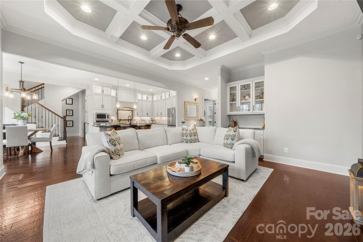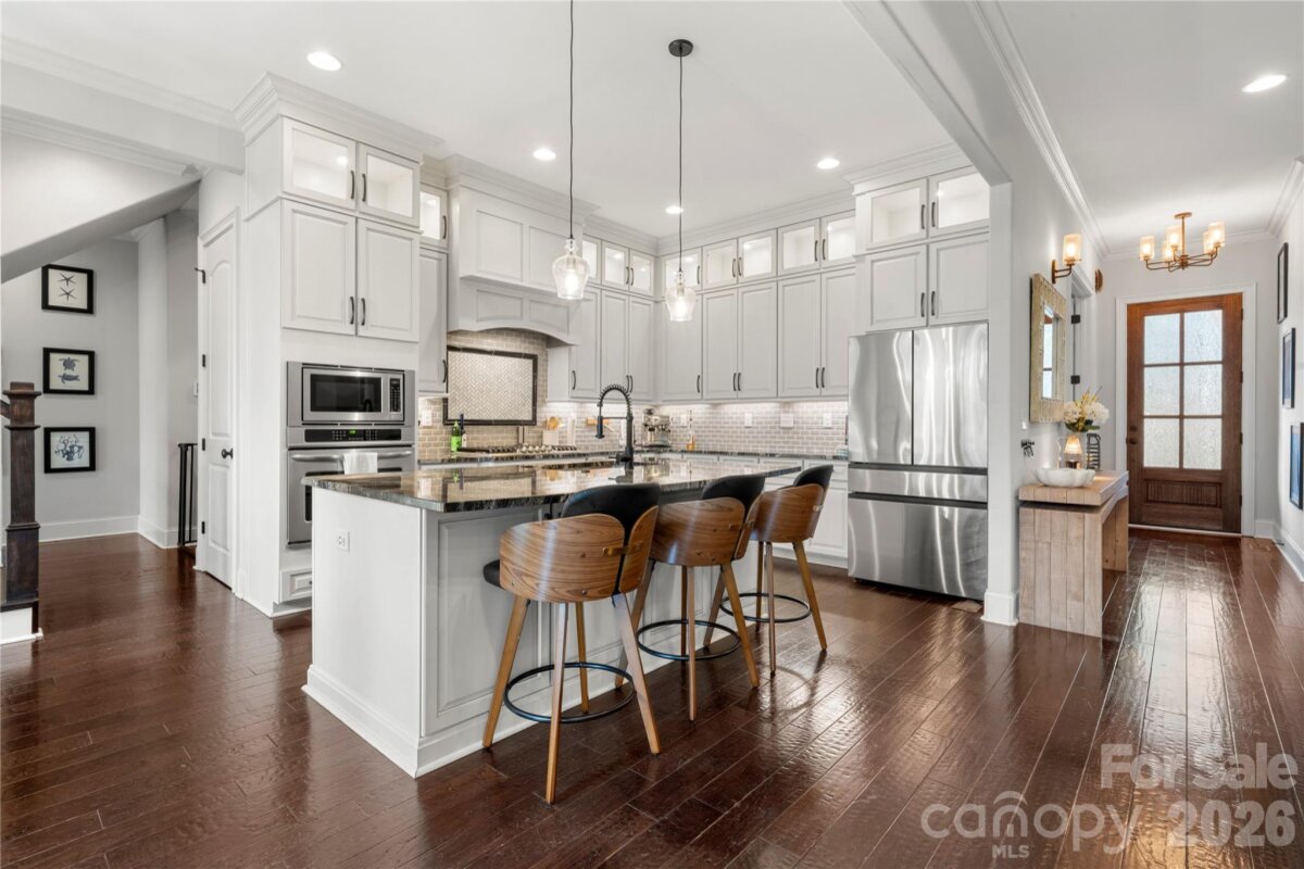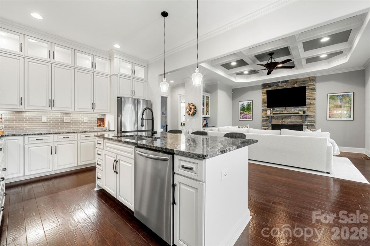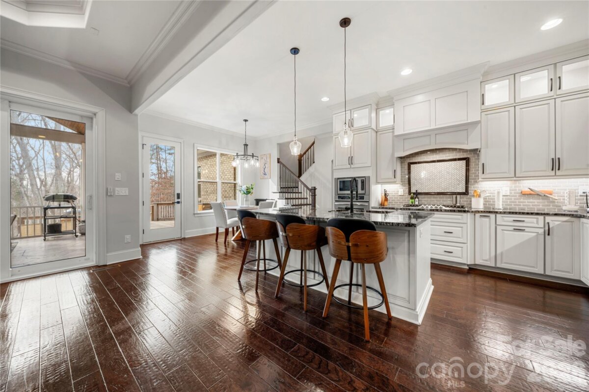 Beautifully crafted country-style home with manicured landscaping and a deep rocking-chair front porch that welcomes you in. This custom-built residence is filled with thoughtful details, including coffered ceilings in the great room and a stunning stone fireplace that anchors the space. The gourmet kitchen features glass-front custom cabinetry with interior lighting, a granite-topped island, classic subway-tile backsplash, and a gas cooktop perfect for everyday cooking or entertaining. The main-level primary suite offers a true spa-like retreat with a frameless walk-in shower cave and multiple shower heads. Also on the main floor is an office and two additional bedrooms connected by a Jack-and-Jill bath, providing flexibility for family or guests. Upstairs, you’ll find a bonus room and an additional bedroom ideal for guests, hobbies, or a media space. Step outside to an entertainer’s paradise with incredible outdoor living areas, including a two-tier deck and a screened porch with all-season doors that open directly to the great room, creating seamless indoor-outdoor flow for gatherings and backyard barbecues. This exceptional home blends custom design, comfort, and timeless charm in a setting made for relaxing and entertaining.