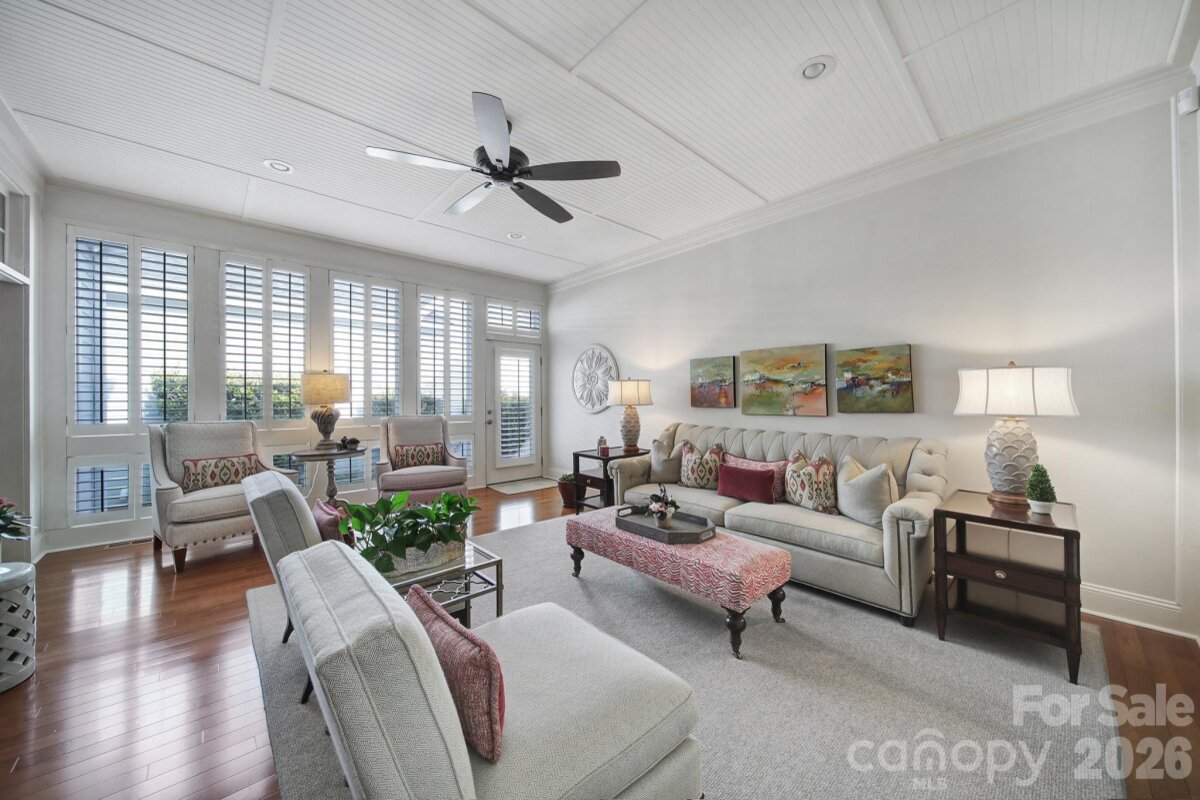 Tucked within the tree-lined streets of the award-winning Ardrey community—known for its Charleston-style architecture, wonderful amenities, and true neighborhood feel—this beautifully upgraded home blends timeless Southern elegance with modern comfort. Located on a quiet cul-de-sac overlooking a community park and fountain, the home offers exceptional indoor and outdoor living. The open kitchen features a large island with gas cooktop and seating for up to six, refinished cabinetry, upgraded LG stainless steel appliances, and a GE Monogram beverage cooler. Wood plantation shutters, wide-plank oak floors, extra-large crown molding, and designer lighting elevate the main living spaces. The primary suite includes custom his-and-hers closets and a spa-inspired bath renovated in 2021 with dual quartz vanities, oversized shower with bench, soaker tub, and custom storage. Additional highlights include a marble-surround gas fireplace with custom built-ins, a flexible front room ideal for an office or playroom, a converted screen porch now serving as a spacious den, multiple covered porches, a brick paver patio with natural gas grill connection, abundant storage, extensive system upgrades, and a large, private backyard with wooded views—perfect for kids and pets.