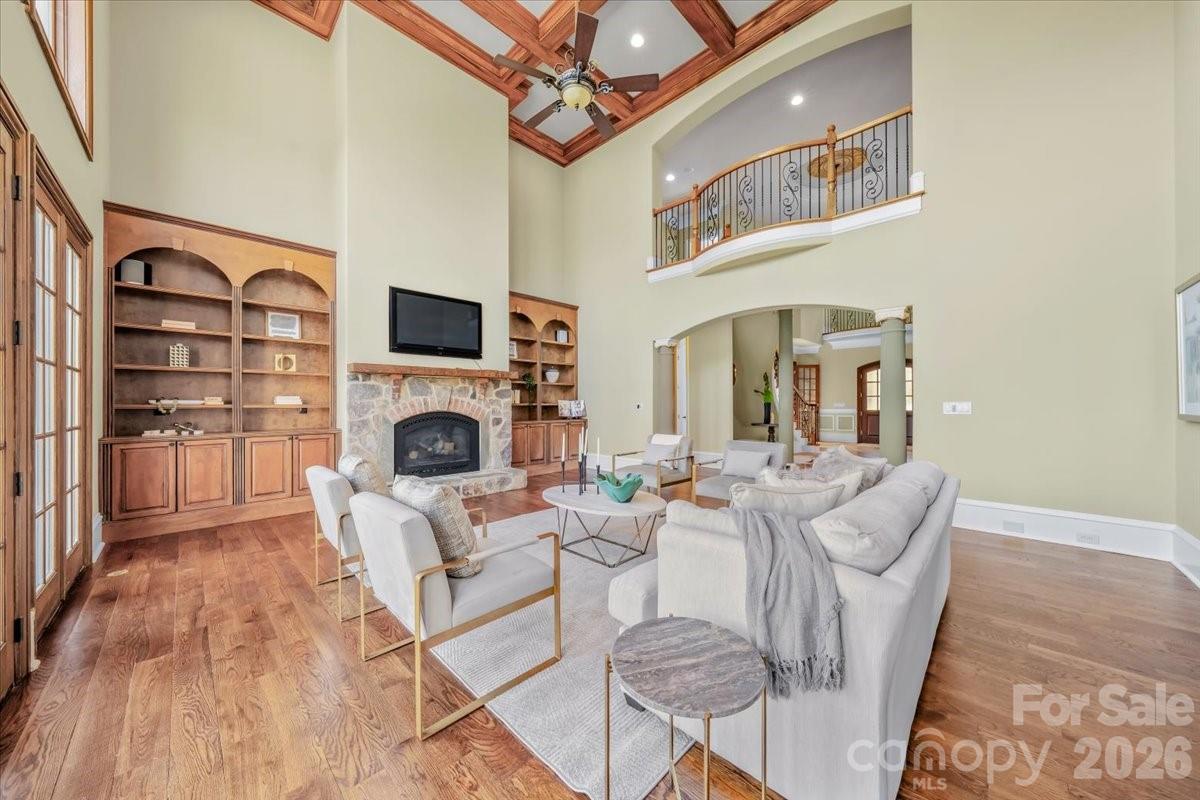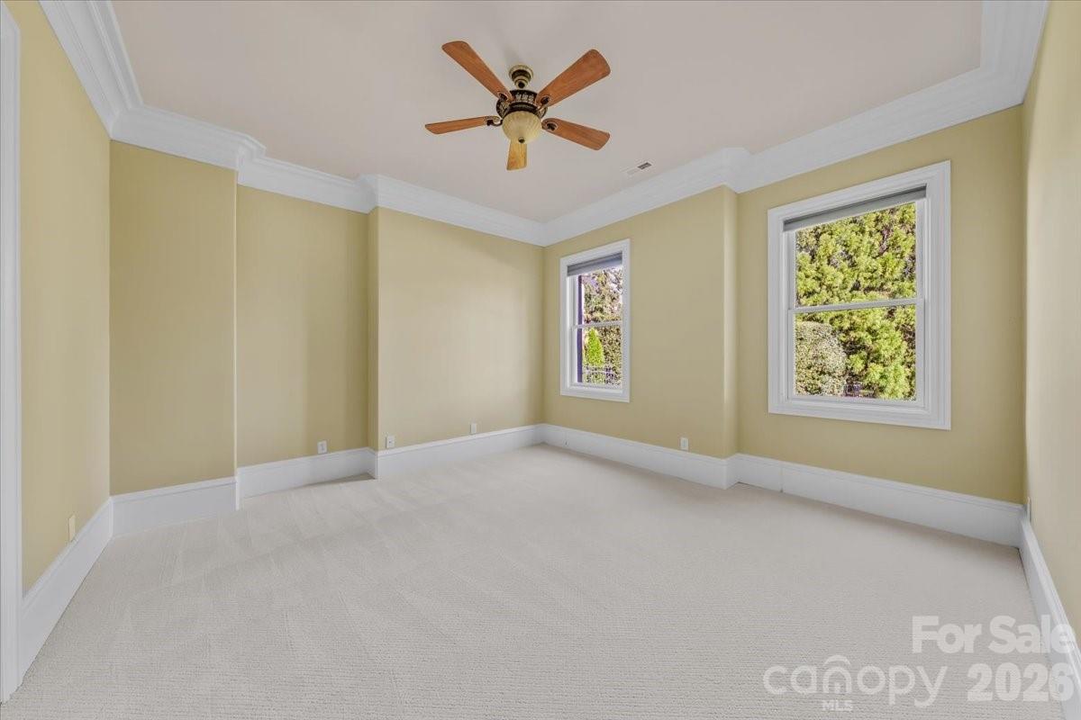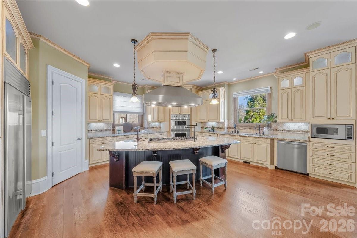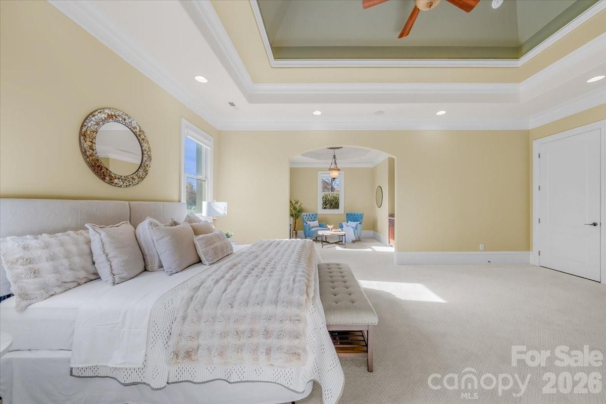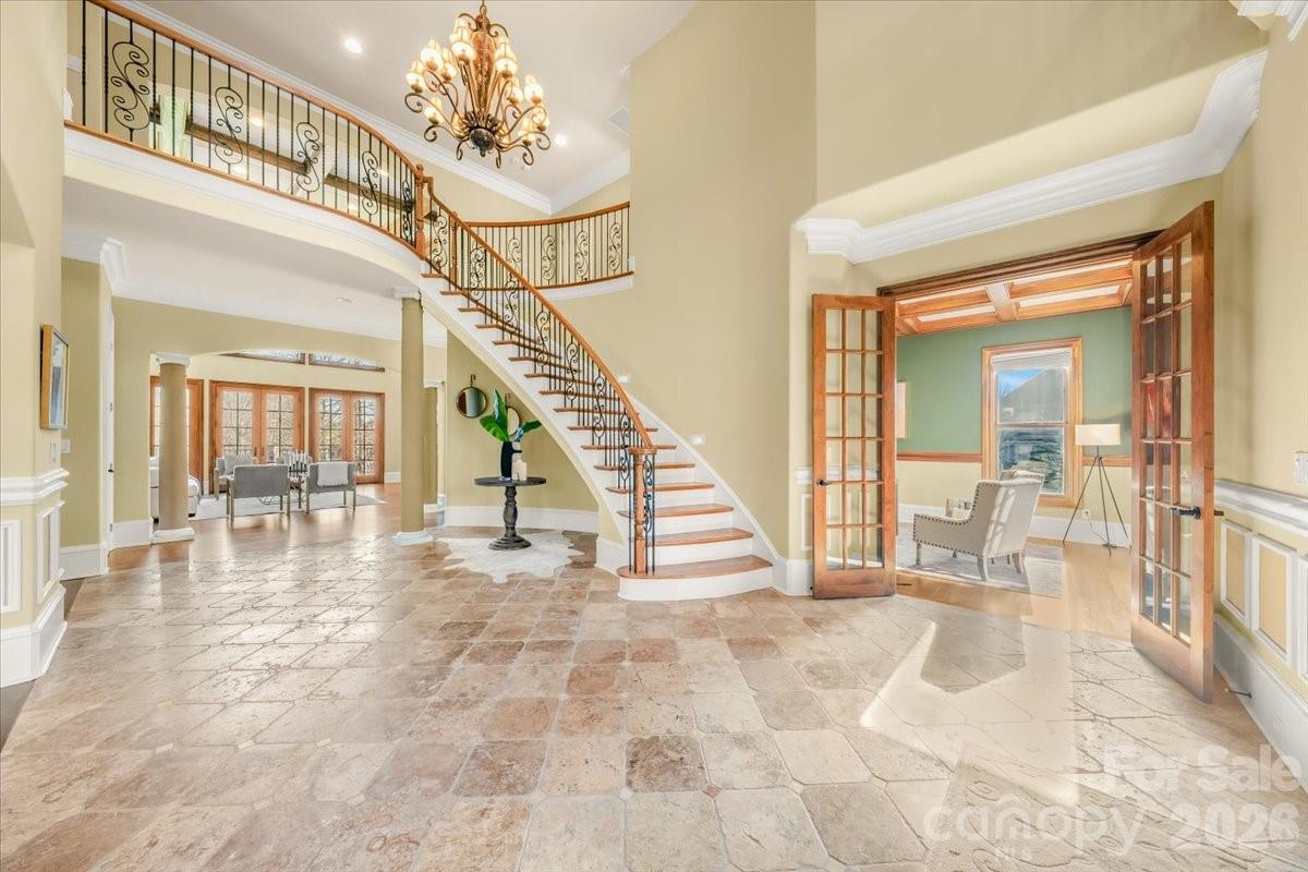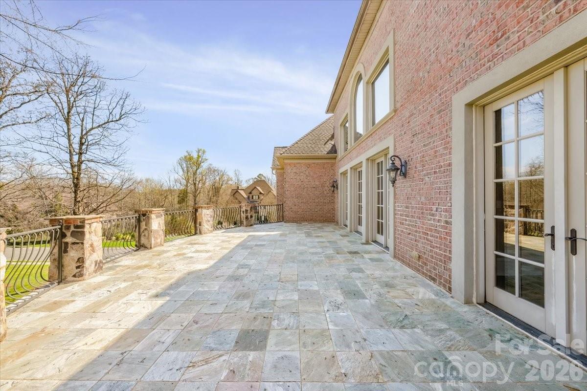 Introducing this exquisite custom-built luxury estate in highly sought-after Providence Downs South, where architectural elegance meets exceptional functionality. This all-brick masterwork offers an unparalleled level of privacy and sophistication. Step through the impressive arched double doors into a spectacular two-story foyer featuring classic travertine tile flooring, intricate wainscoting, and a gracefully curved wrought-iron staircase. Arched passageways lead to the spacious formal dining room, perfect for hosting grand gatherings. French doors open to a prestigious executive office complete with a rich wood coffered ceiling and gorgeous built-in bookshelves. The dramatic, vaulted great room boasts a massive wall of floor-to-ceiling windows and doors, anchored by a beautiful stone fireplace and custom built-ins. Culinary enthusiasts will admire the gourmet kitchen, which features cream-colored stacked cabinetry, a monumental dark wood contrasting center island, gleaming granite countertops, a Viking professional gas range, double ovens, and high-end panel-ready refrigeration. Extend your entertaining outdoors from the main level onto an oversized balcony, offering a serene vantage point overlooking the lush, private backyard. Designed for ultimate privacy and comfort, this home features 5 generous bedrooms plus a 6th bed/bonus room, with EVERY bedroom including its own pristine, dedicated full en-suite bath. An additional 2 elegant half-baths serve guests. Ascend to the versatile third floor, an expansive space perfectly suited for a vibrant game room, home gym, or secluded private retreat. The mudroom/utility room is equally impressive, with high-end cabinetry, granite counters, and a utility sink. The sprawling, finished walk-out basement is a destination in itself. Entertain in style with a dedicated movie theater featuring stadium seating, accompanied by a full professional bar. This level is also perfectly equipped as a private in-law or guest apartment, complete with its own second full kitchen, a spacious living area, and a private bedroom with a full en-suite bath. Step seamlessly from the basement out to a phenomenal paved back patio. This magnificent outdoor living area is built for year-round enjoyment, featuring both a built-in firepit and a stunning outdoor fireplace. Perfectly situated in the quiet elegance of Marvin, NC, this estate is a rare find, combining superior craftsmanship, abundant square footage, and a floor plan optimized for modern, high-end living.