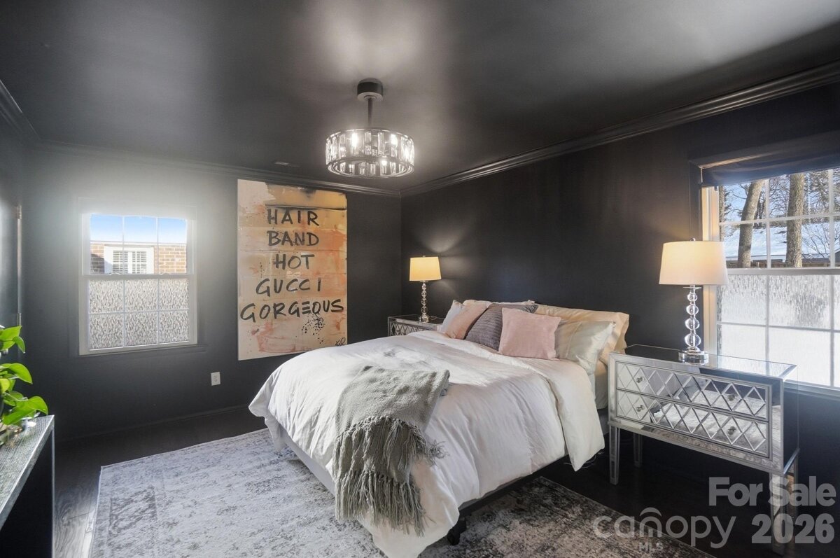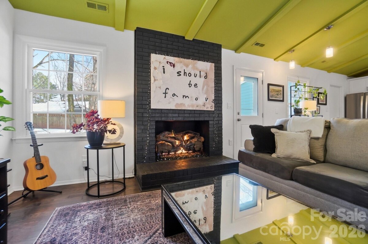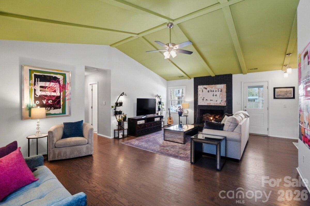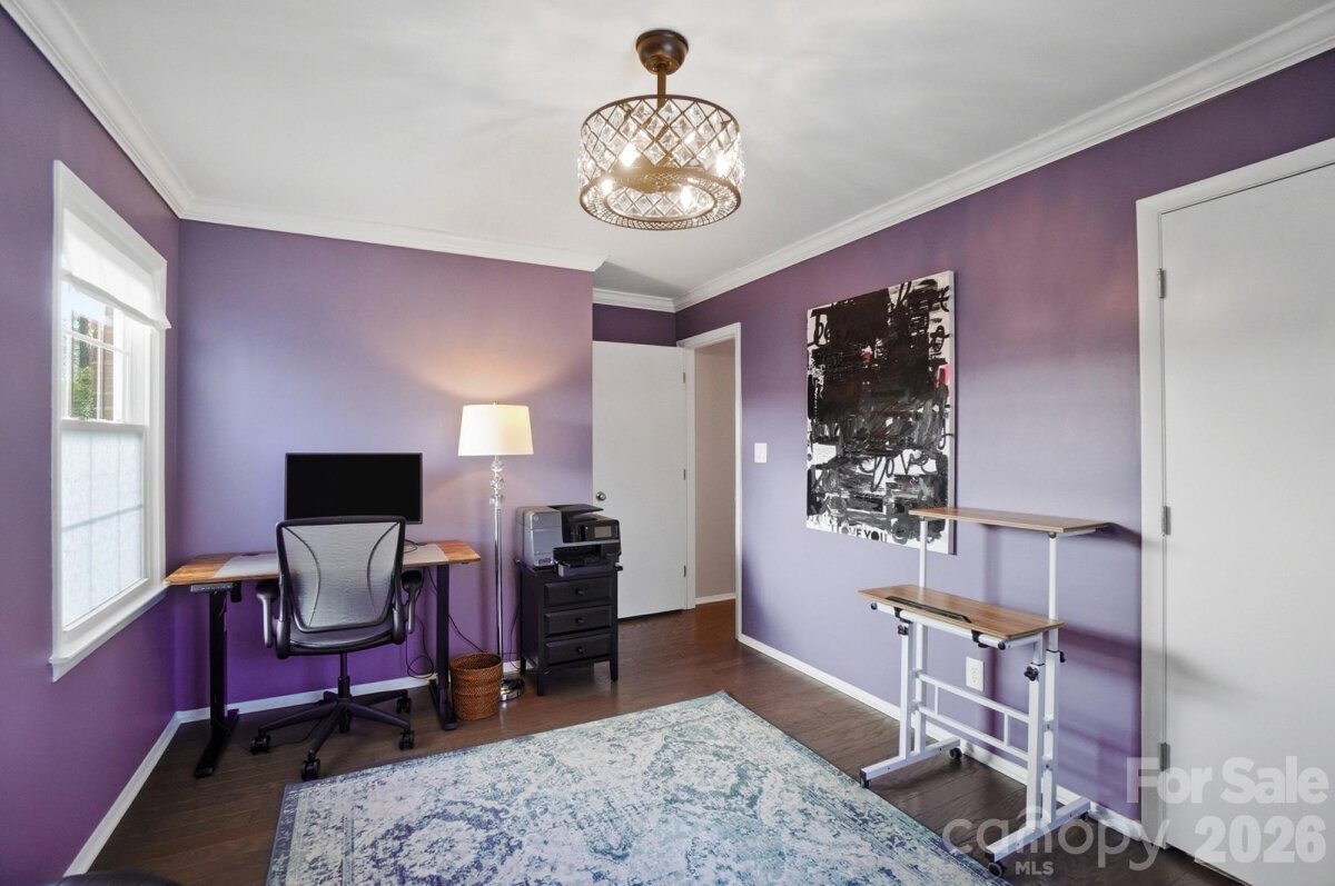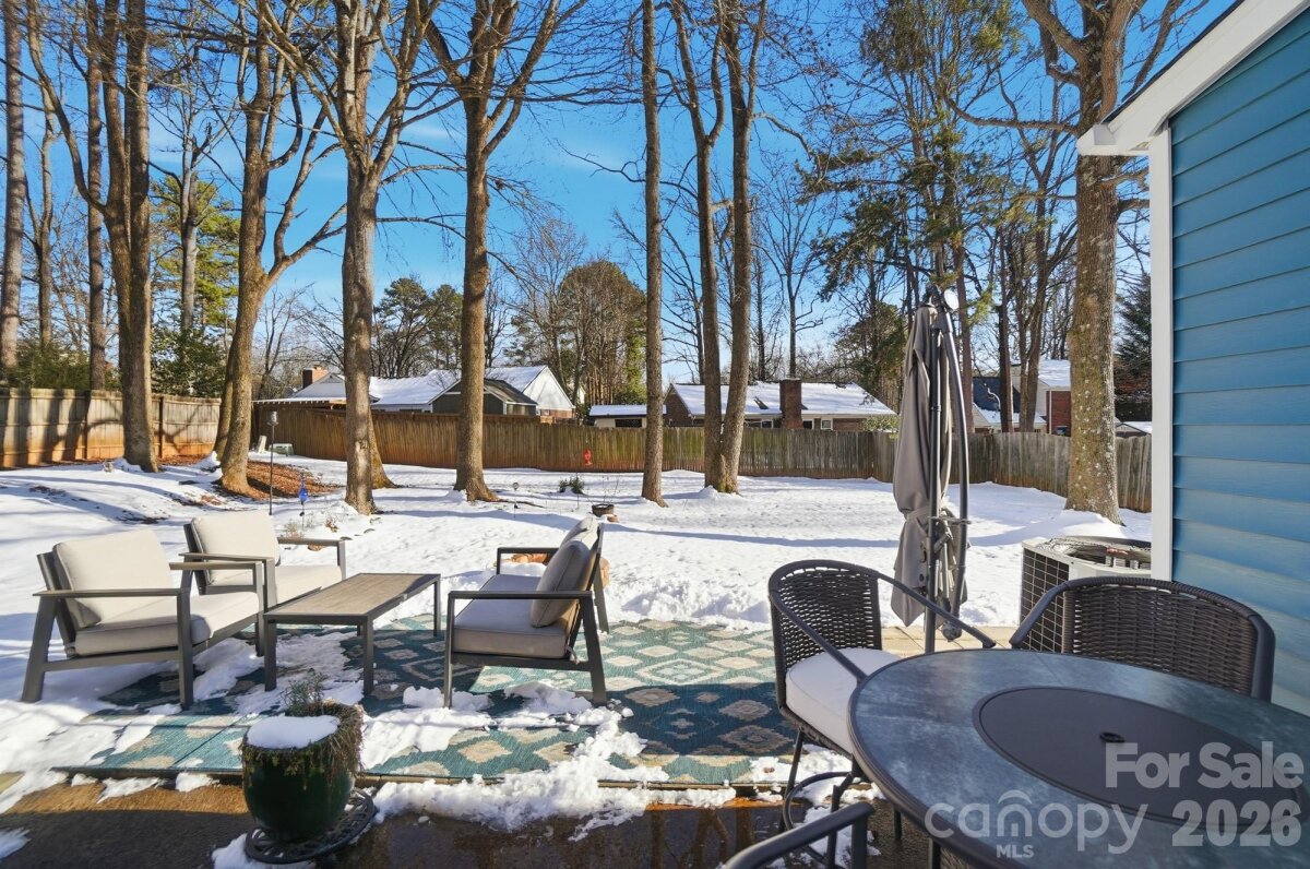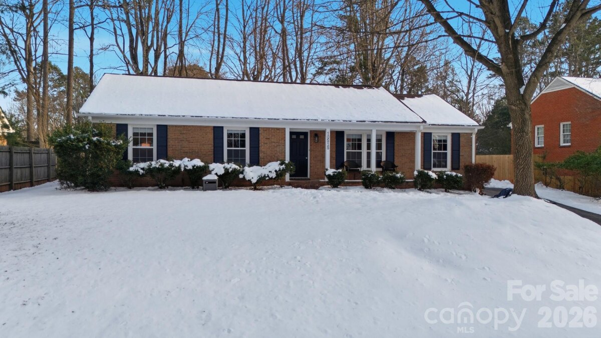 Classic full-brick ranch nestled on a quiet, elevated cul-de-sac street in the highly desirable Sardis Forest neighborhood, offering timeless curb appeal, a welcoming front porch, and a peaceful residential setting. Inside, the home features a bright, open layout with hardwood floors throughout, newer windows, vaulted ceilings, updated lighting, and a well-designed flow that is both functional and inviting. The foyer opens seamlessly to the main living spaces, including a spacious living room centered around a floor-to-ceiling masonry fireplace with new gas logs and direct access to the rear patio, creating a calm and comfortable atmosphere for everyday living. An open kitchen and dining area showcase timeless white cabinetry with soft-close drawers and cabinets, a smooth-top range, and ample workspace for everyday living and entertaining. Just off the main living area, a dedicated office or study with French doors provides an ideal work-from-home or flex space. The private primary suite is tucked at the rear of the home and features an updated ensuite bath. Two well-sized secondary bedrooms are located at the front of the home and share a full hall bath. Custom adjustable closet systems throughout are designed for flexibility and organization. All three bedrooms, as well as the study, include crown molding, adding a refined architectural touch. Outdoors, the fenced backyard is private and park-like, featuring a paver patio and fire pit, perfect for relaxing or gathering with friends. Solid brick construction, a single-story layout, and thoughtful updates throughout make this home move-in ready. Optional Sardis Forest Swim Club membership may be available. The home is ideally located near shopping, dining, parks, and walkable greenway access. Don’t miss this rare opportunity to own a classic ranch in one of South Charlotte’s most established neighborhoods.
